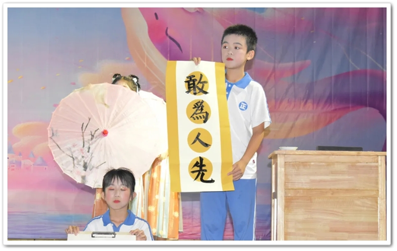 《舞动墨韵》节目将书法与舞蹈艺术有机融合,一动一静,形成独特的艺术表现。孩子们现场书写的书法作品充分展示了正源小学部在语文“四模块”上创新与实践的成果。