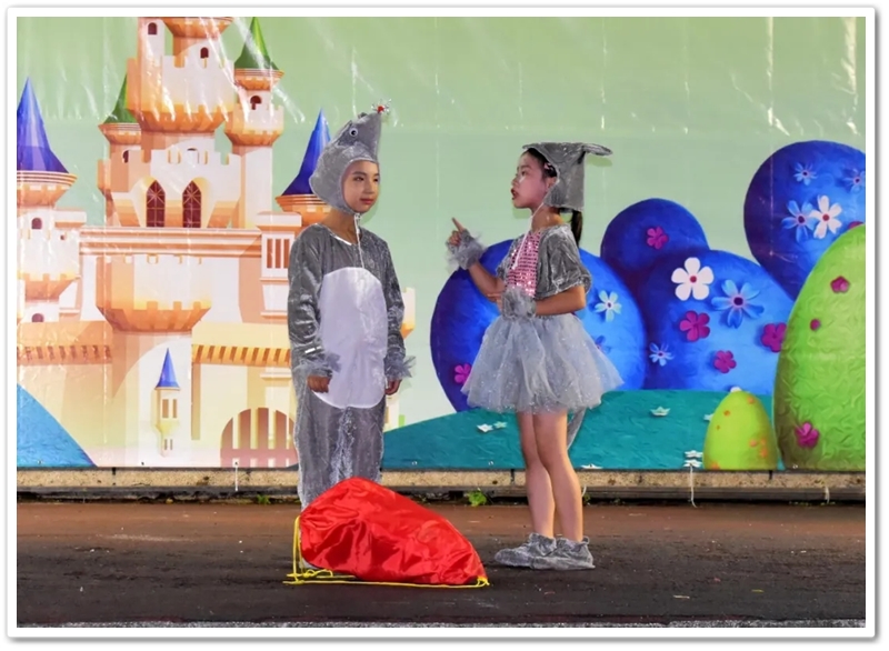 《老鼠偷米》——小老鼠偷了大米,最后被机智勇敢的警察发现了,受到了严厉的惩罚。一个活泼有趣的故事,一年级孩子们表演得惟妙惟肖,同时告诉我们要做一个具有正义感的人。