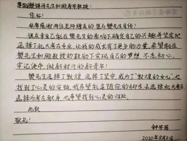 当时的钟芳蓉就曾在给樊锦诗先生的回信中说:“希望能追随您的脚步,去选择北大考古,选择为考古献身,也希望找到心灵的归处。”