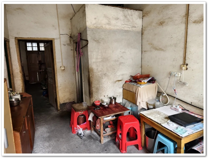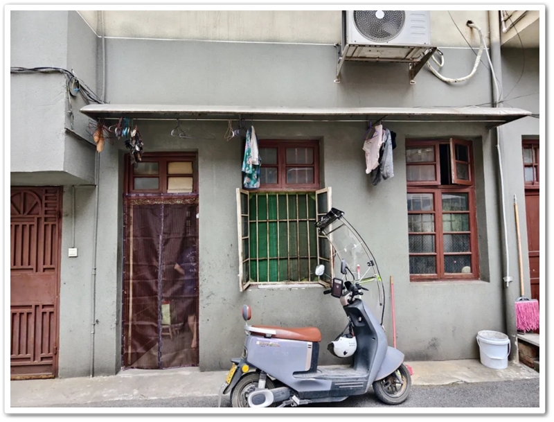 “文星高照”楼匾正对着的马路对面是老旧的建庭巷。巷内蜘蛛网一般的电线,斜的斜,绕的绕,层层叠叠纵横交错。行至一条小门,崭新的图钉将一张斑驳的防蚊网严严实实钉在刷过红漆的门框上。左边镶块玻璃、右边嵌张瓦楞纸,门楣顶窗上方,几个铁丝衣架锈迹斑斑,稀稀疏疏吊了两条丝瓜囊,和几条海带。
