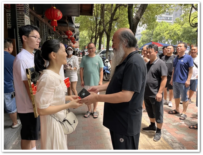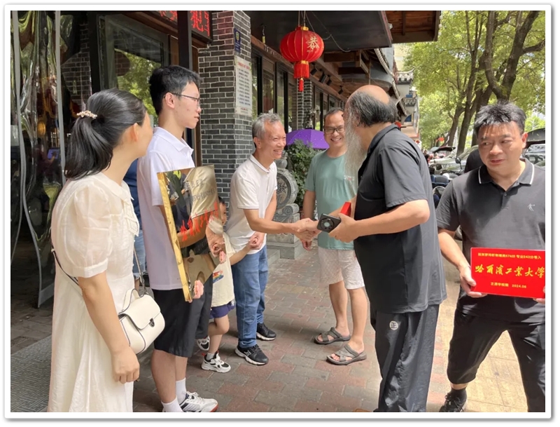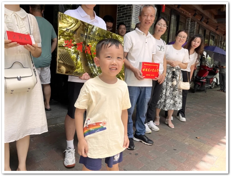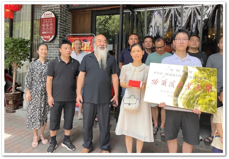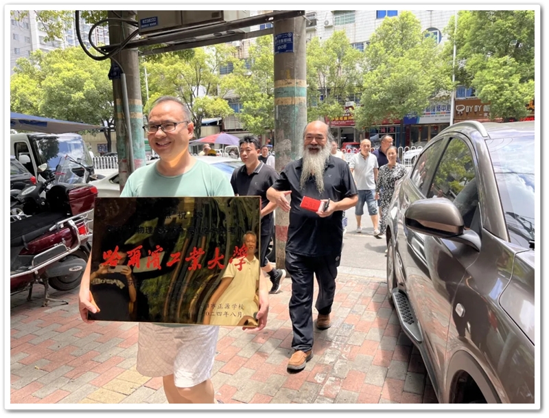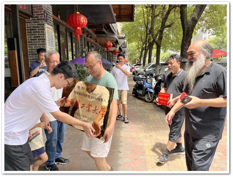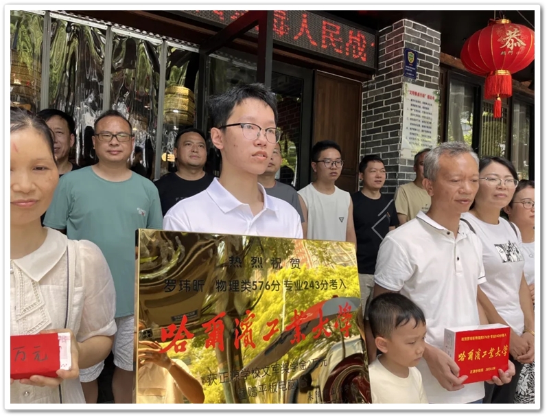 8月2日,罗校长率初中年级主任曹秋文,初中班主任何礼健,高中班主任李颂华、李海文及老师同学们,带着奖励铜匾、平板电脑及2万元文军奖学金来到蔡伦中路,祝贺罗玮昕物理类576分、美术专业243分考取985名校哈尔滨工业大学。