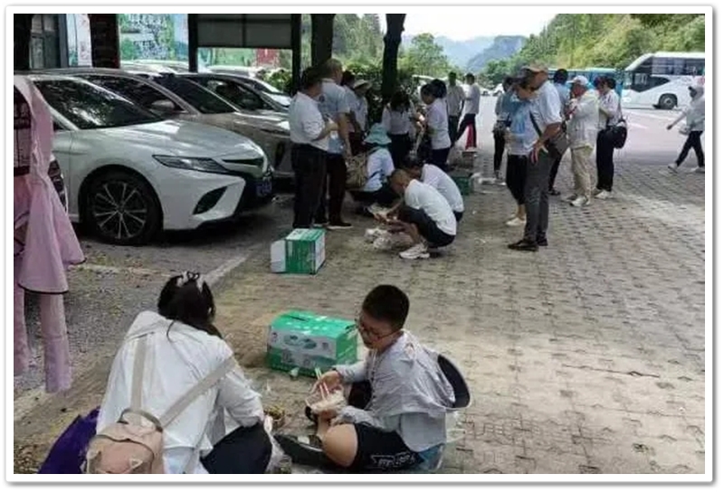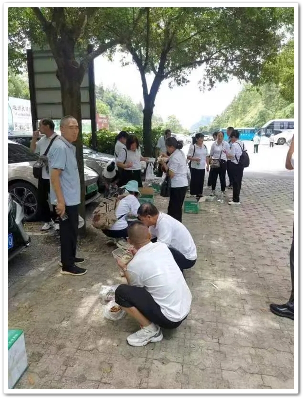 刚一下车,一股清凉而湿润的气息扑面而来,瞬间驱散了路途的疲惫。几名年轻的同志自发地把从学校带来的正源盒饭从大巴行李箱中搬下来分发,盒饭是今天清早学校食堂的师傅们精心为旅游团准备的,有爆炒牛肉、素炒兰包、酸豆角炒蛋,色香味俱全,大家边吃边开玩笑地说“正源盒饭,味绝天下”。
