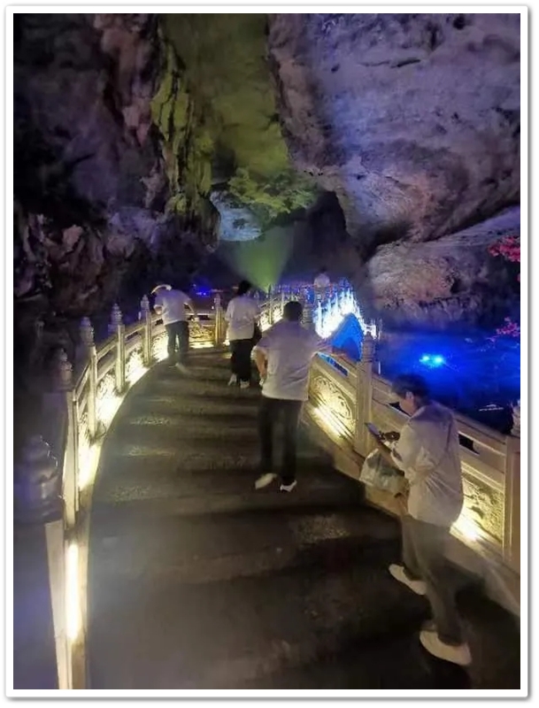 接着,我们沿着曲折的通道来到了“飞瀑奇石”区域。瀑布从洞顶倾泻而下,如同一匹白色的绸缎,水花四溅,发出清脆悦耳的声响。而周围的奇石更是千姿百态,有的像昂首挺胸的狮子,有的像憨态可掬的熊猫,让人目不暇接。员工们有的拿出手机拍照留念,有的则沉浸在这美景之中,静静地感受着大自然的魅力。