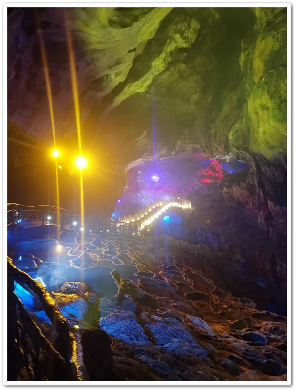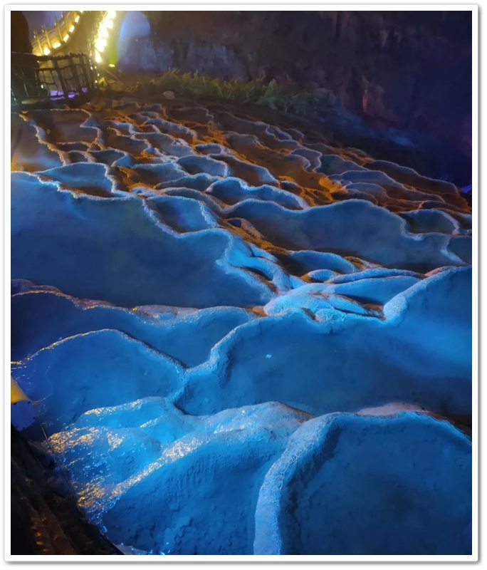 继续深入,眼前出现了一片层层叠叠的“仙人田”。那一块块犹如梯田般的岩石,仿佛是仙人辛勤耕耘的成果。田中的“水流”清澈见底,在灯光的照耀下波光粼粼,如梦如幻。大家纷纷猜测着这奇特景观的形成原因,相互交流着自己的想法,气氛热烈而融洽。