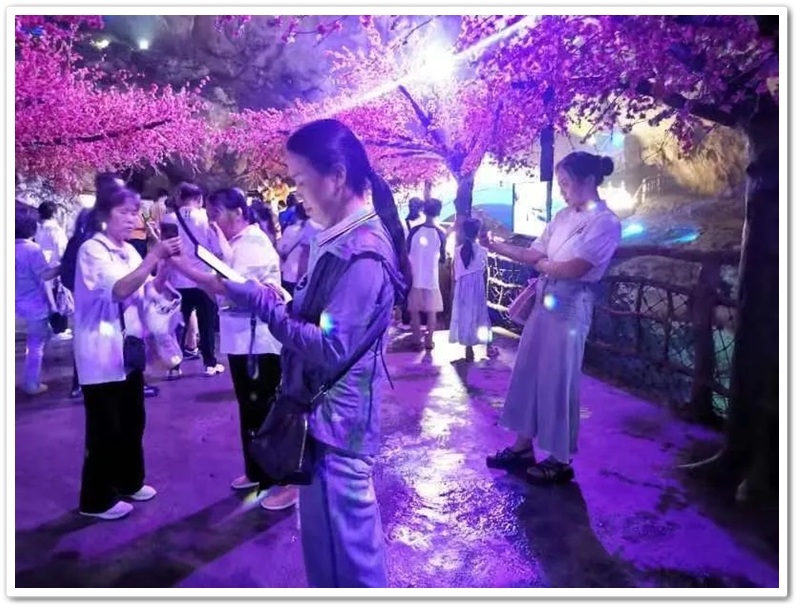 行不远处,连州地下河的桃花桥,宛如一条优雅的绸带横卧在地下河的水面之上。桥身精致而古朴,仿佛承载着岁月的记忆。桃花桥的桥头,粉色的桃花在灯光的映照下如梦幻般绽放,行人们纷纷驻足观赏,合影留念。桥下,清澈的河水潺潺流淌,水波荡漾,倒映着桃花桥的倩影,使整座桥显得更加空灵而迷人。踏上桃花桥,仿佛步入了一个世外桃源,让人陶醉在这如梦如幻的美景之中,忘却了尘世的喧嚣与纷扰。