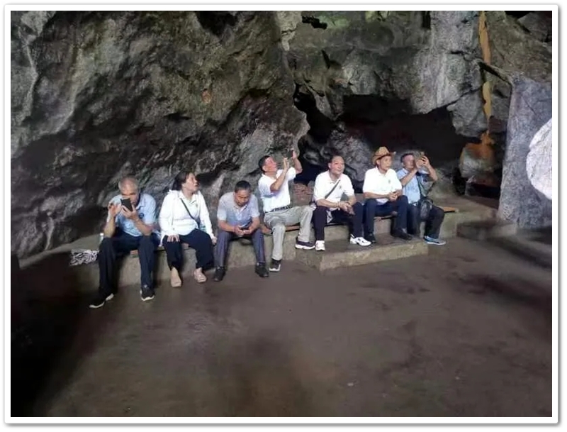 吃的快的同事就各自忙着拍照打卡了。我们团队中的越战退役老兵黄昊军胸挂勋章特别引人注目,他满脸幸福地在“洞河仙境”的牌匾前留影。待全体用餐完毕,在连州地下河的牌坊前,大家兴奋地站成一排,笑容满面,随着相机快门的按下,我们留下了广东第一张珍贵的合影,这一刻,喜悦与期待被定格在了画面中。