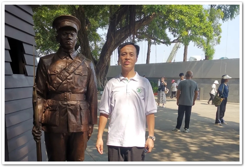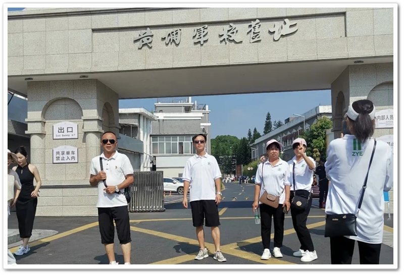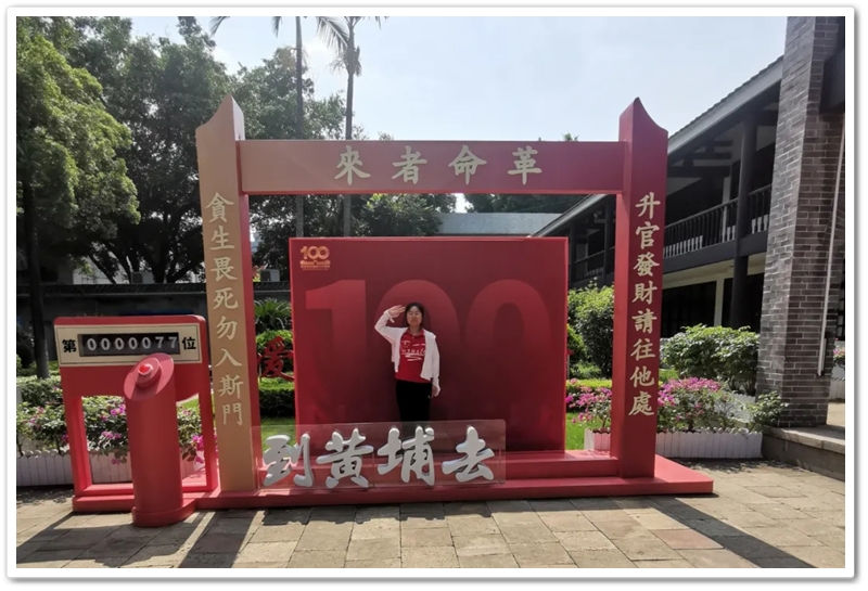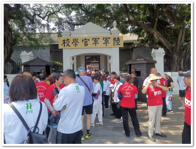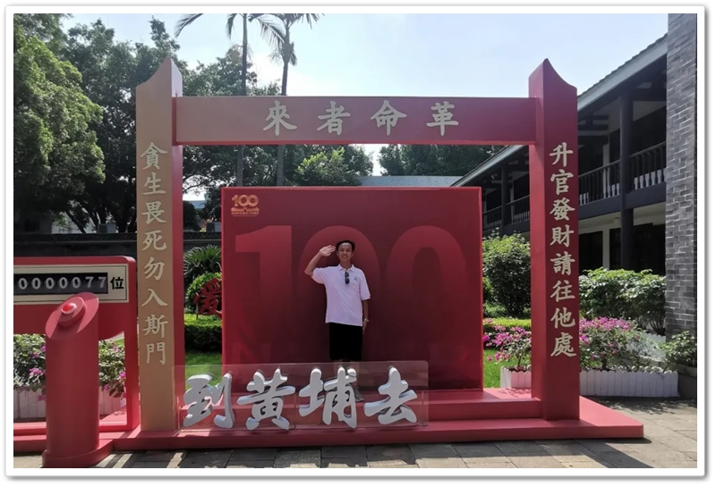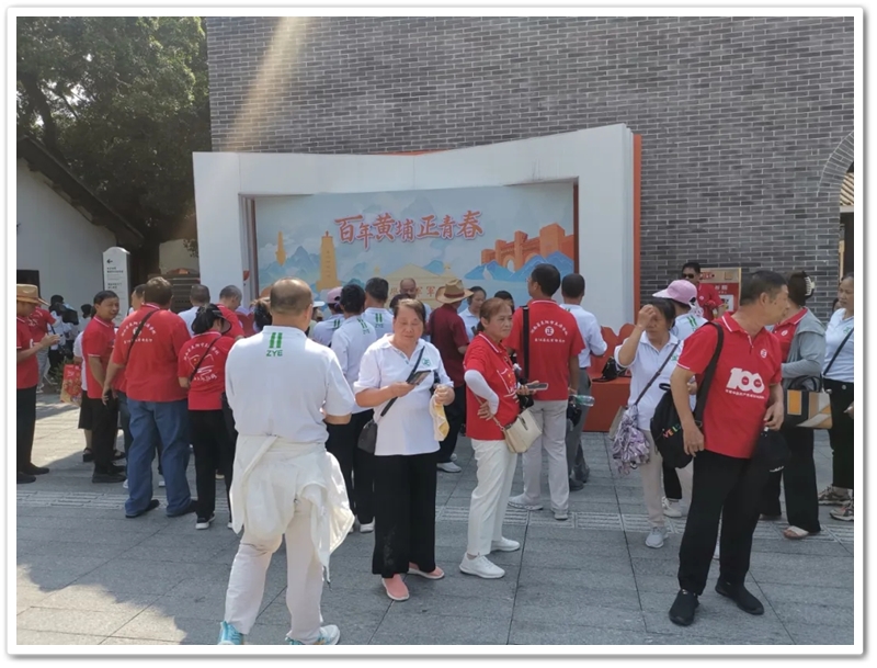 终于,黄埔军校旧址的大门出现在眼前。大家怀着激动的心情,纷纷在黄埔军校旧址的牌楼前拍照留念,一行人快速进到景区,东瞧西看,到处搜寻历史的记忆,然后来到“百年黄埔正青春”宣传橱窗前拍下了广州之行的首张合影,合影中的每一张笑脸都饱含着对这段历史的敬意。