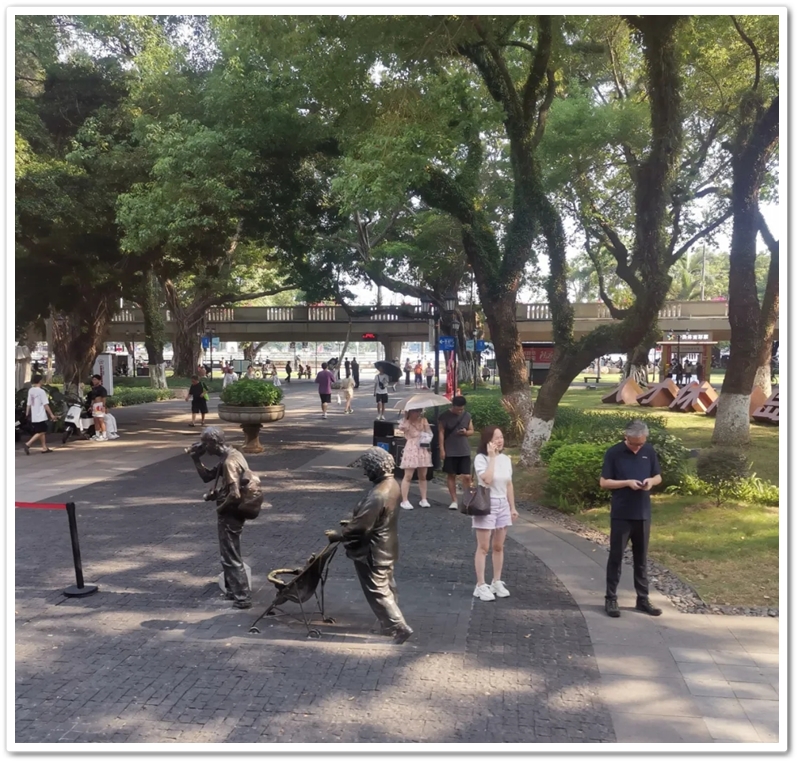 参观完南越王宫遗址,我们又乘车前往沙面岛。坐在车上,沙面岛的独特风貌逐渐展现在眼前。街道两旁,古老的欧式建筑错落有致,风格各异。那些精美的雕花阳台、庄重的罗马柱,在绿树的映衬下显得格外迷人。透过车窗,我们仿佛看到了历史的痕迹,想象着曾经在这里发生的故事。同事们兴奋地指着窗外,交流着自己的发现。“看那栋楼,多有特色!”“这建筑风格太漂亮了!”一位大妈感叹道:“这地方真美,就像画里一样。”