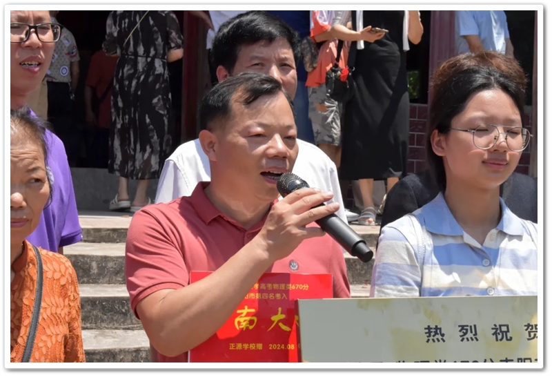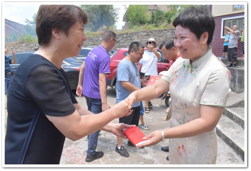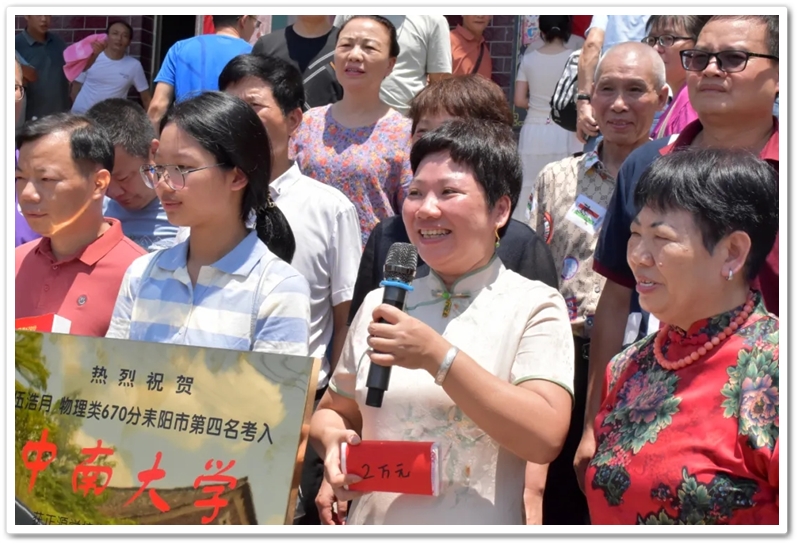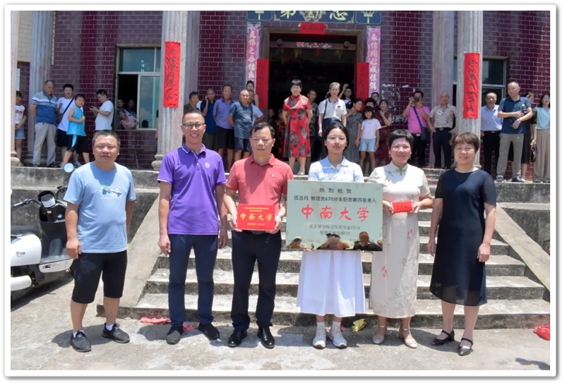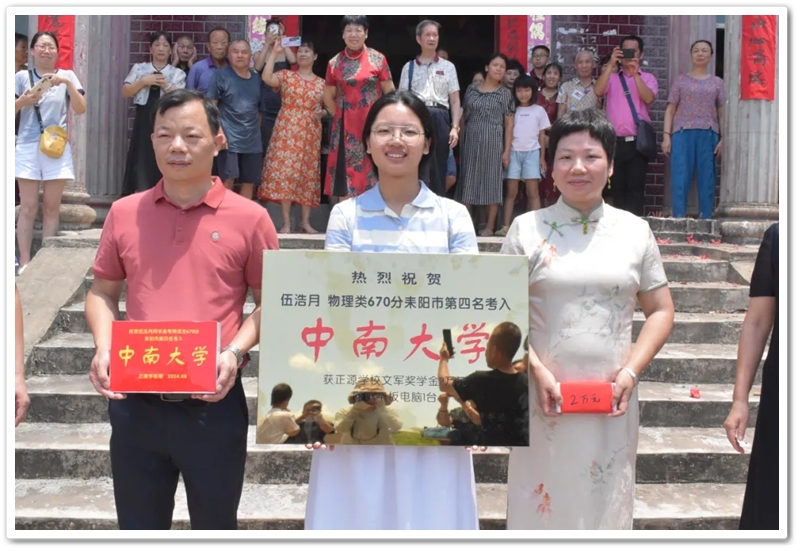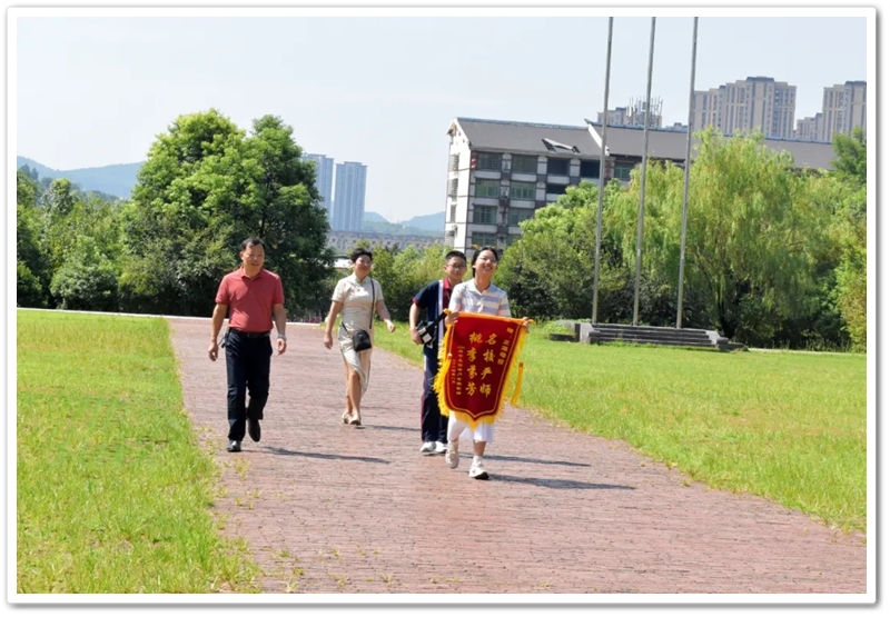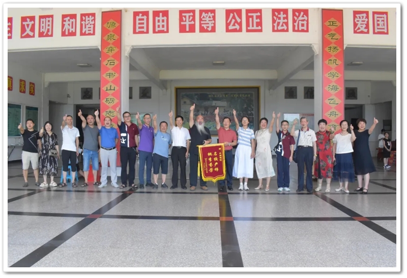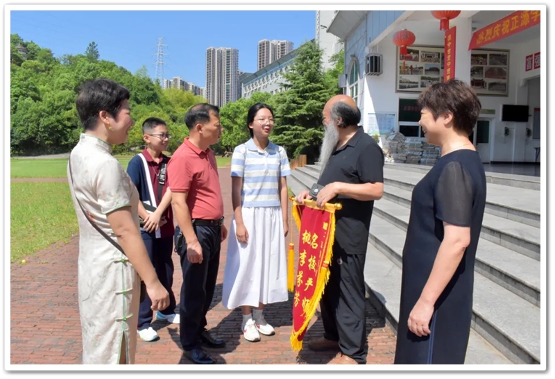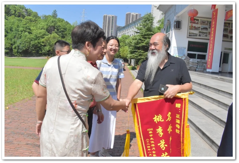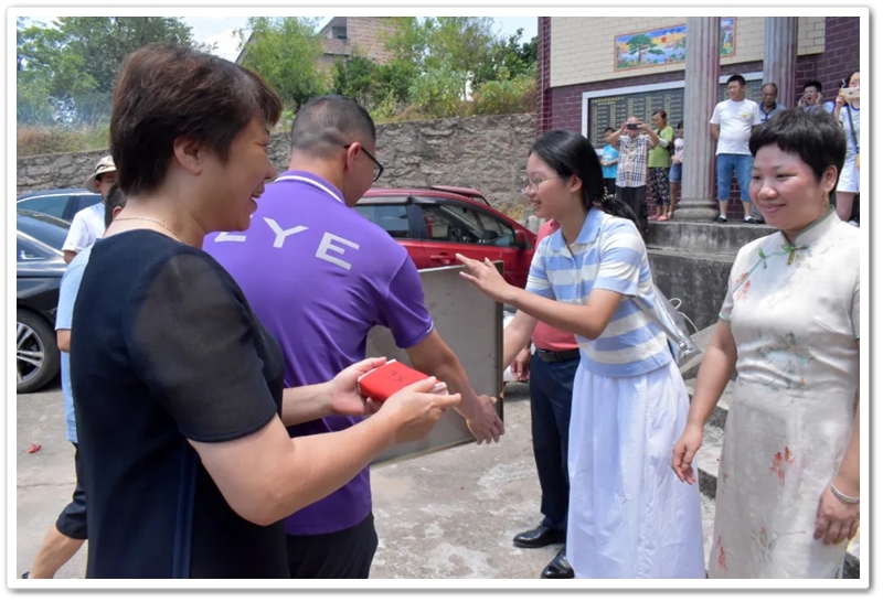 8月8日上午,伍浩月一家带着锦旗早早来到学校,以“名校严师 桃李芬芳”致敬母校、感怀师恩,全家走进校园致谢,盛情迎接老师同学们去她老家祠堂赴升学宴。