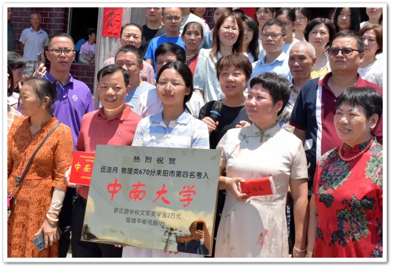 中午时分,村子里鞭炮轰鸣、礼花冲天,班主任李海文老师送上奖励铜匾,资忠主任送上平板电脑,梁老师递上2万元文军奖学金,老师同学及亲友们纷纷祝贺,伍家祠堂前热闹非凡,喜气洋洋。