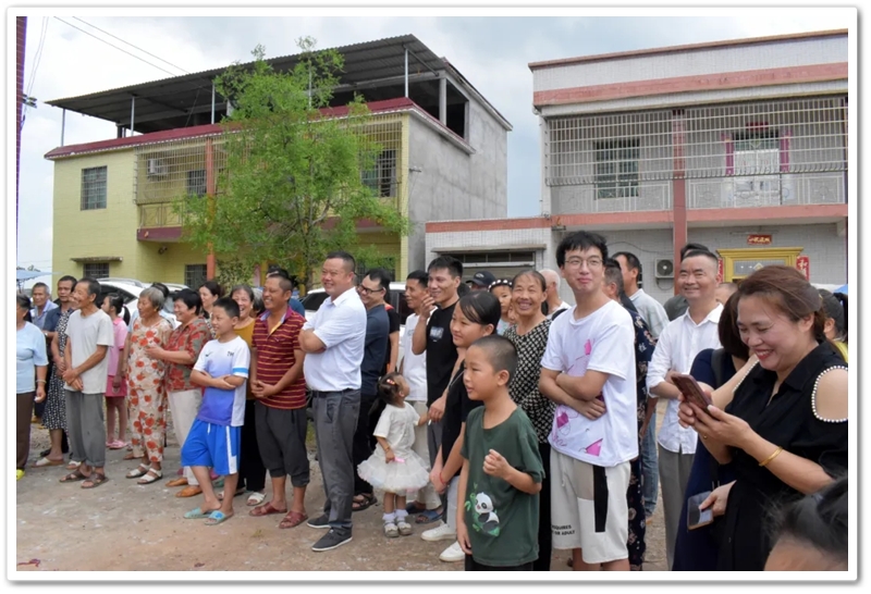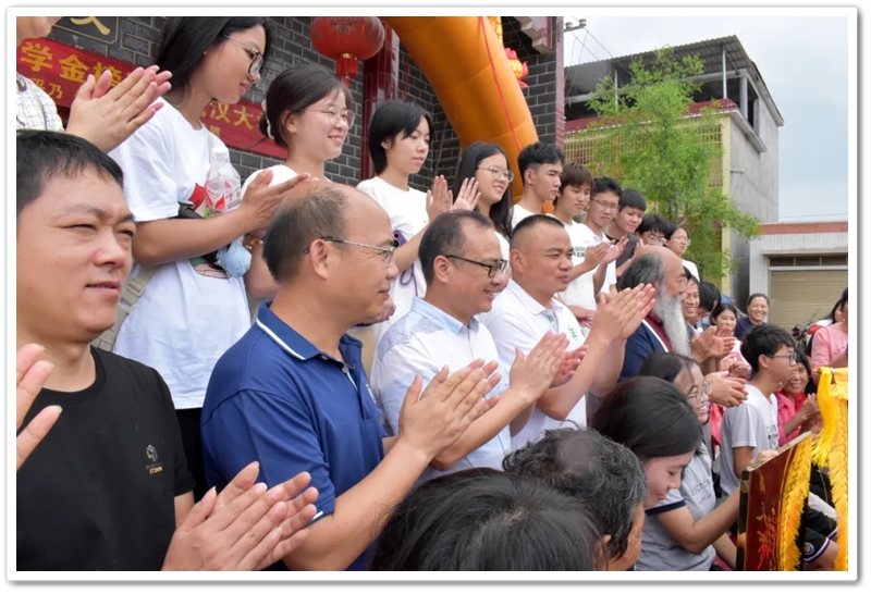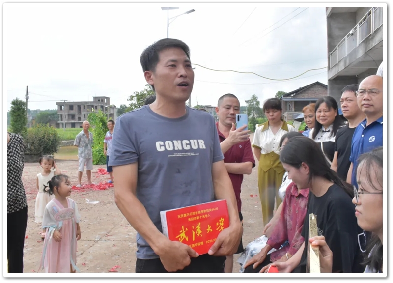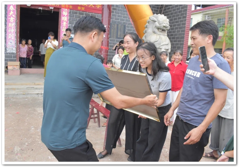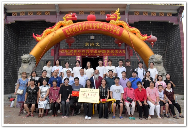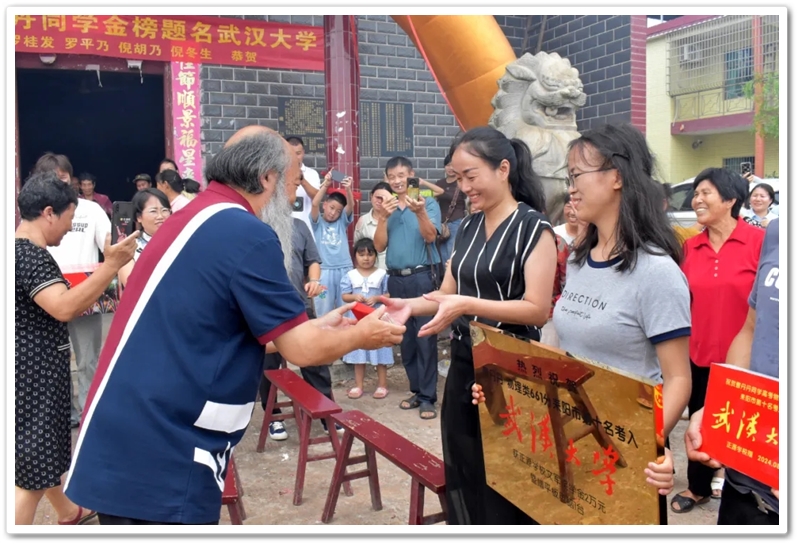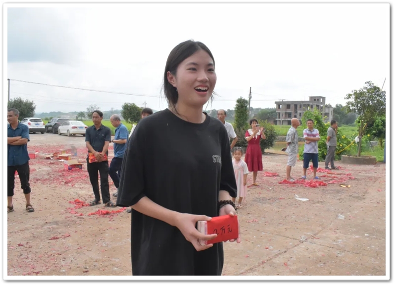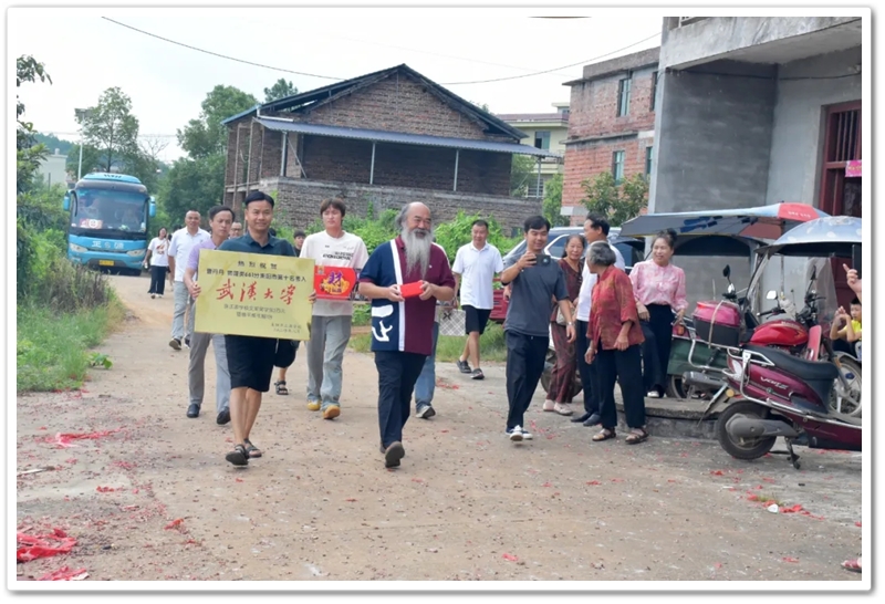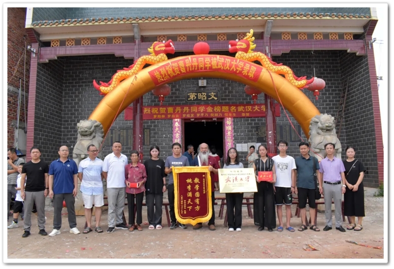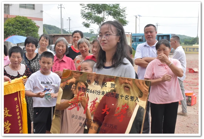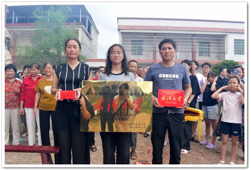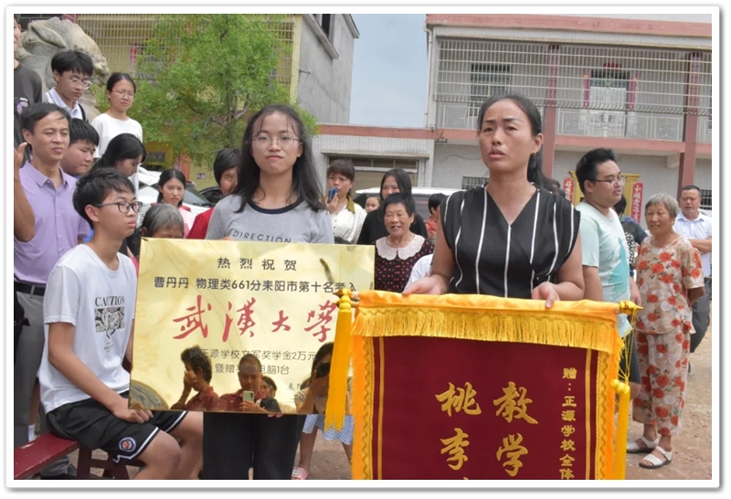 8月20日,罗校长率小学年级主任刘礼雄、初中年级主任曹秋文、高中班主任张建文及老师同学们带着烟花鞭炮、颁奖铜匾、平板电脑和2万元文军奖学金,浩浩荡荡来到马水乡泉边村6组,祝贺村里留守女孩曹丹丹物理类661分考取武汉大学弘毅学堂。