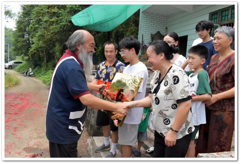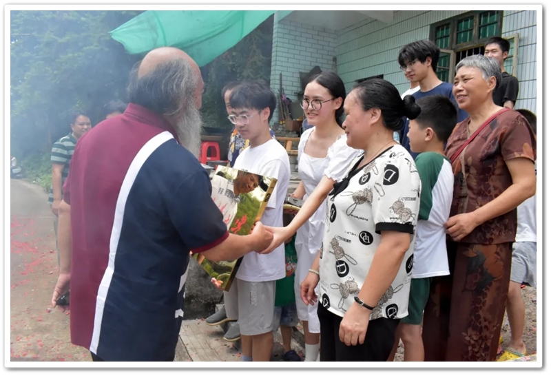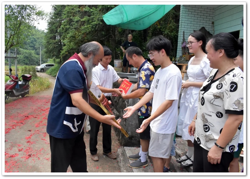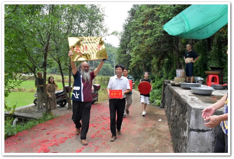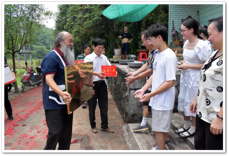 颁奖仪式在李家门前台阶举行。罗校长一洗奔波疲劳,花白大胡子脸上绽开了快乐的笑容。罗校长说,张家铺山清水秀,地灵人杰,“今天是我们南阳镇张家铺李豪家的大喜日子。李豪同学今年以649分的高分,考取武汉大学,在这里,我代表正源学校全体师生,对李豪以及全家表示热烈的祝贺!”