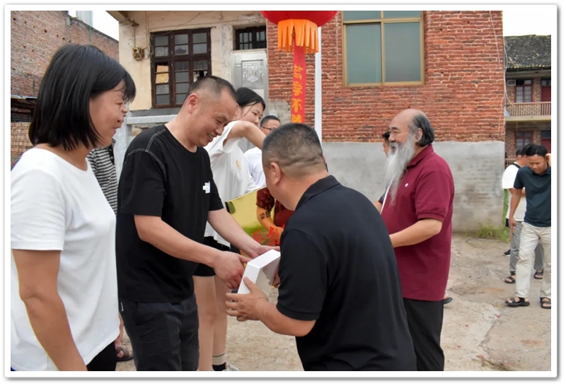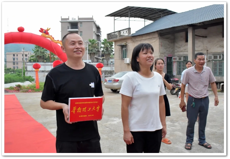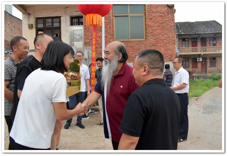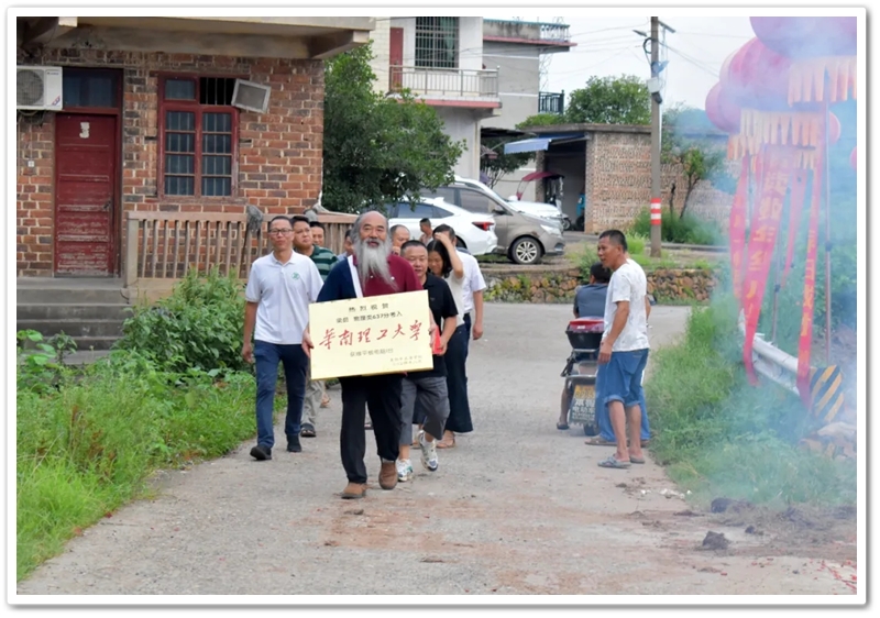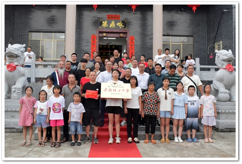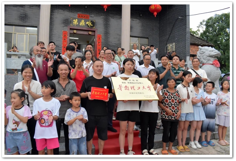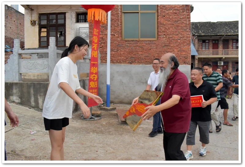8月15日傍晚,罗校长率老师同学们带着平板电脑和颁奖铜匾来到东鹿村2组黄泥坳祠堂前,祝贺村里留守女孩梁茹物理类637分考取985名校华南理工大学。