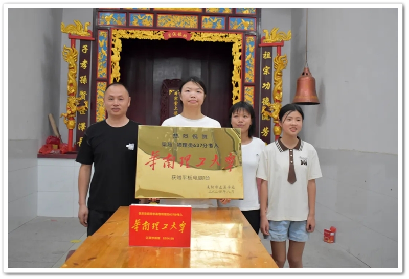 黄泥坳梁氏宗族祠堂内,匾额高悬、桌案整洁庄严肃穆的宗族祭典仪式上,正源学校文军奖学金奖励的平板电脑端置案头。梁茹手捧镌刻“祝贺梁茹考取华南理工大学”的颁奖铜匾伫立于长桌前。鞭炮响起,礼花轰鸣。梁茹父母在宗族长老、村邻亲友及老师同学们见证下,郑重对祖先牌位三拜九叩,虔诚祭拜,告慰先人。