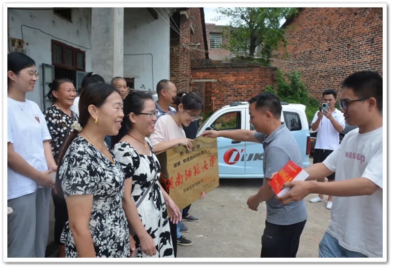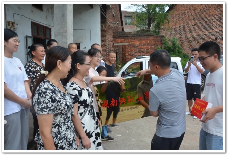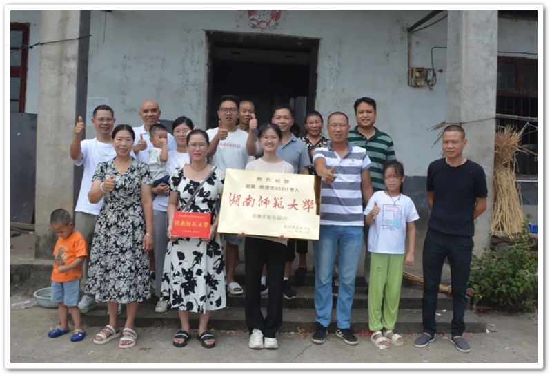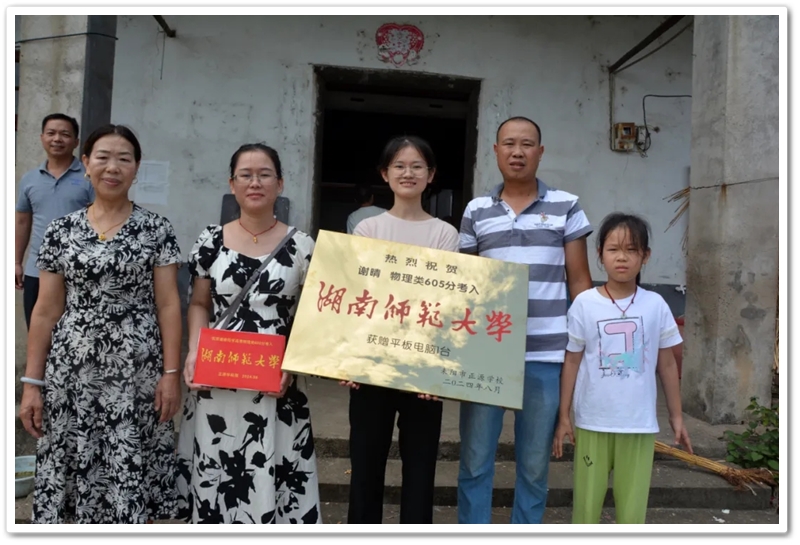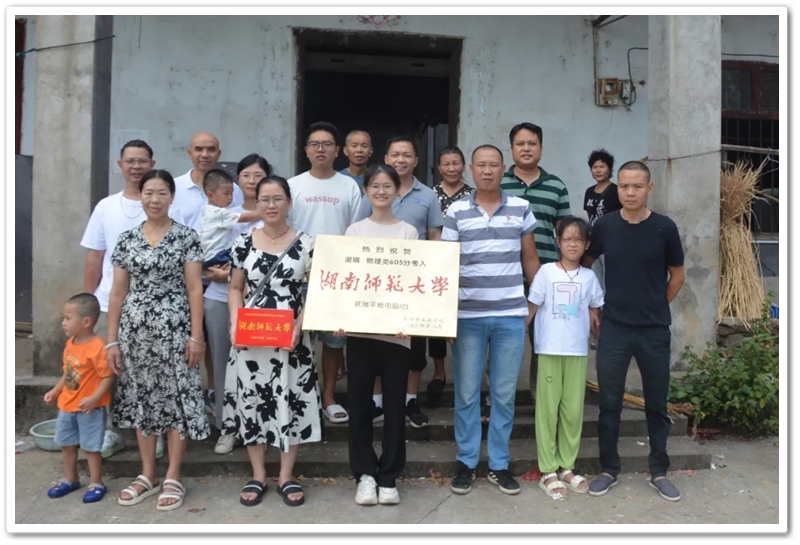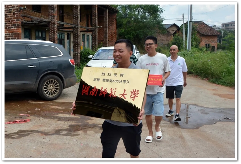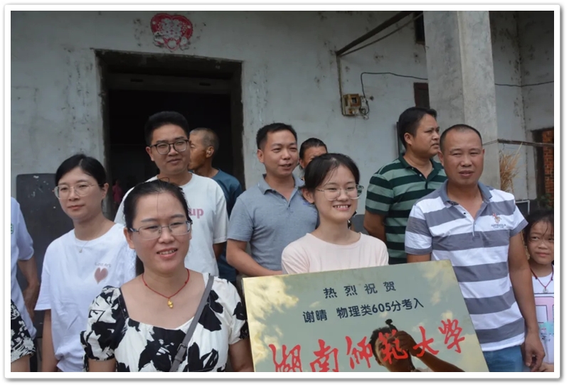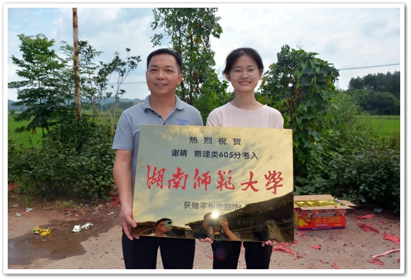 8月28日,班主任李颂华和老师同学们带着烟花鞭炮、颁奖铜匾、平板电脑,来到水东江新联村五组,祝贺谢晴物理类605分考取湖南师范大学。