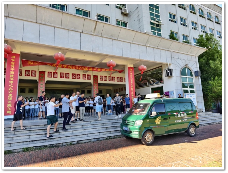 7月16日下午,一辆中国邮政送件车缓缓驶入正源学校,100多名高三学生汇聚大厅齐刷刷的看着车越来越近,罗校长站在人群中意气风发。