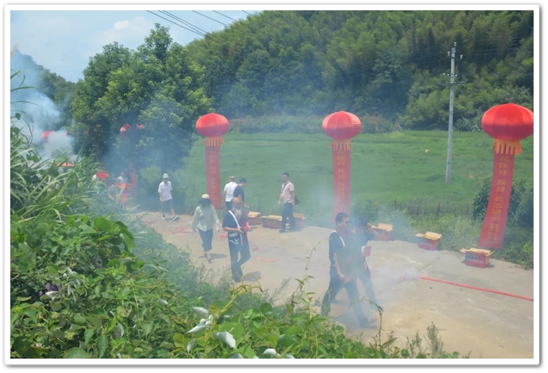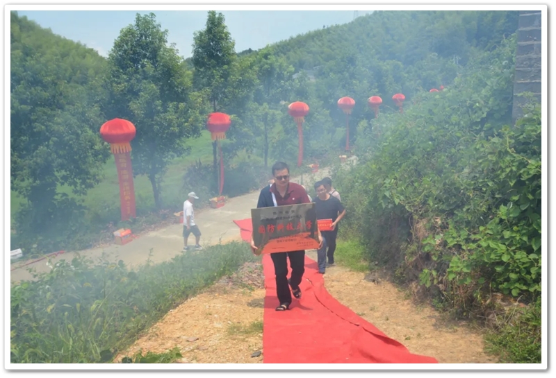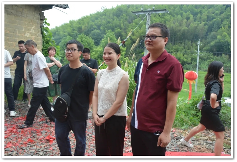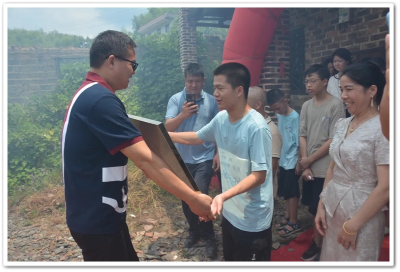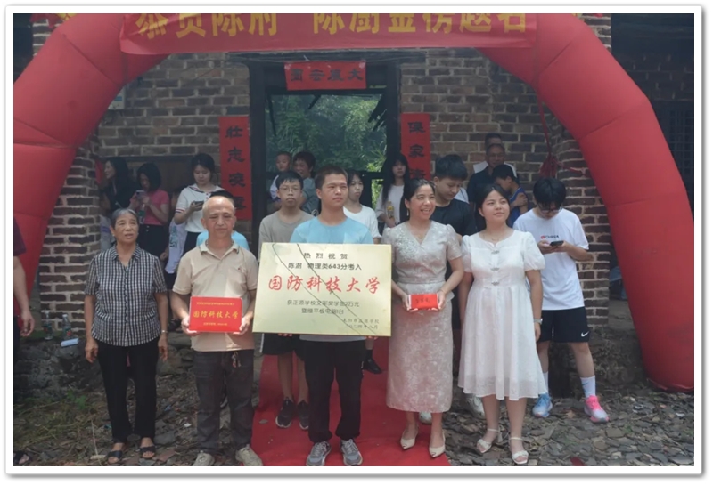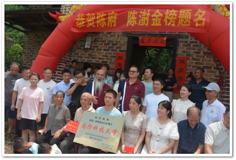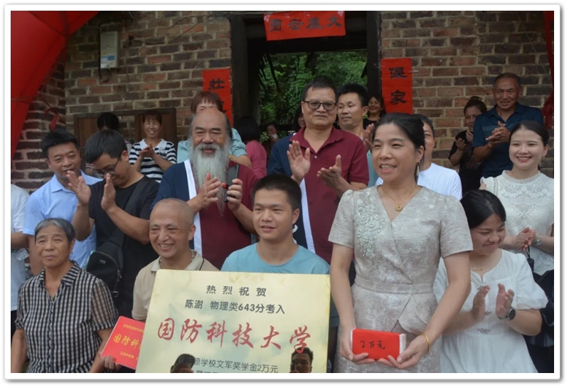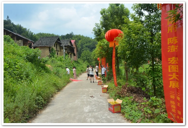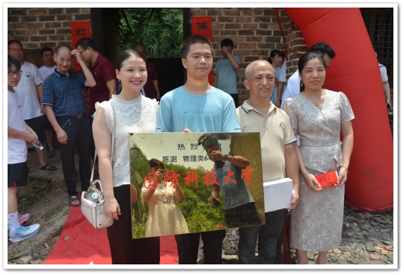 8月11日,夏塘镇福龙村七组热闹非凡,祠堂门口一排红气球沿路绽放,一条红地毯连接着大红拱门和祠堂大门。沿着蜿蜒的乡间小道再往深处走直伸陈澍的老宅。一个转弯,犹如进入世外桃源,两山之间有房有田,一片翠绿铺满了整个画面。罗校长身穿深红色校服带着陈澍的初中、高中老师及学校行政,捧着铜牌、平板电脑和两万元现金走在路上,远远看去,万绿丛中一片红。