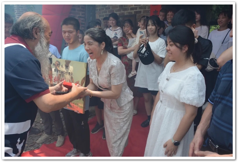 一时间,鞭炮烟花齐鸣,罗校长一行沿坡而上,驻足老宅前。陈澍父母及家人上前迎接,陈澍接铜牌,妈妈接奖金,爸爸接平板电脑,鞭炮声掌声汇成一片,好不热闹。
