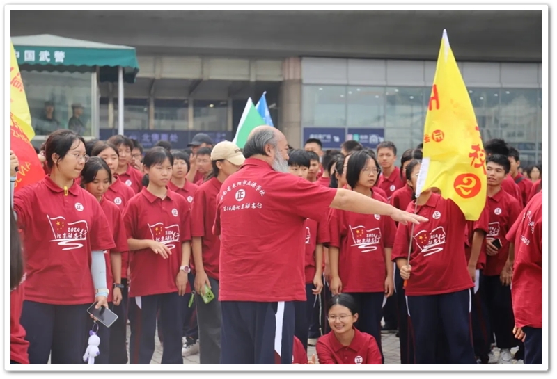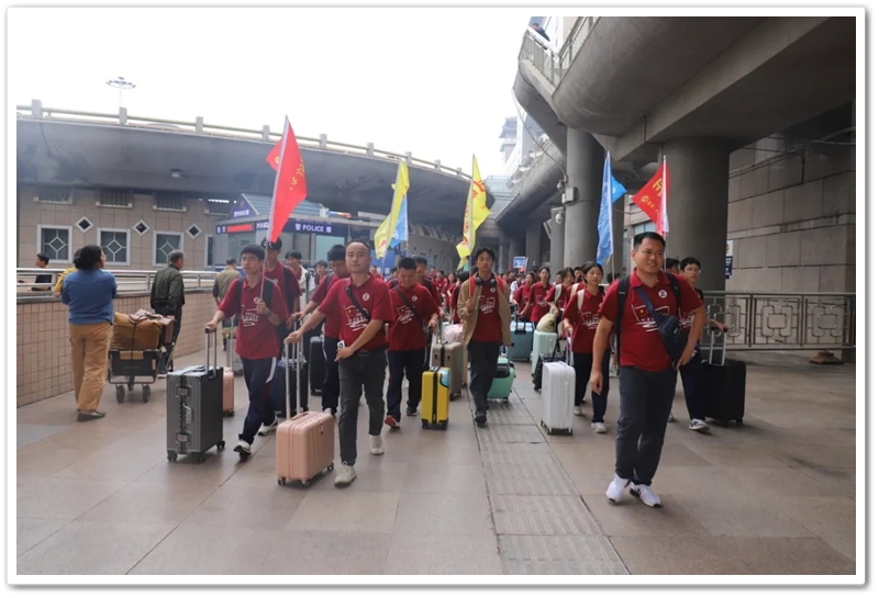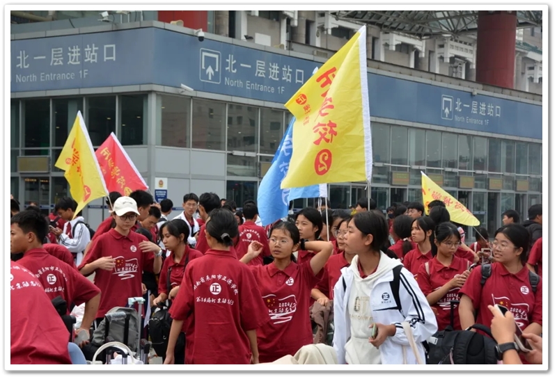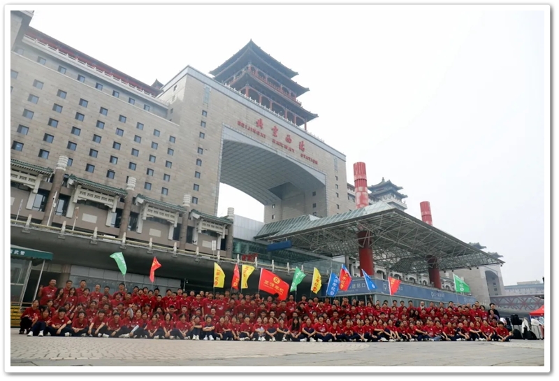 北京西站北广场前,220名正源师生身着正源红,汇聚成一道靓丽风景线。