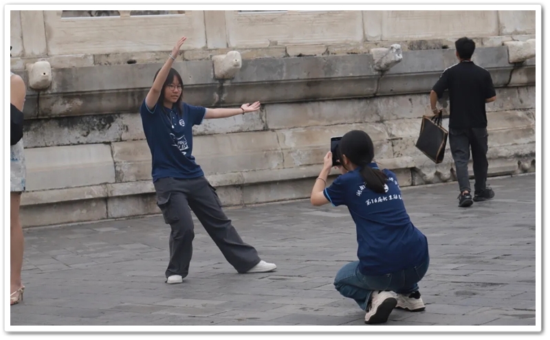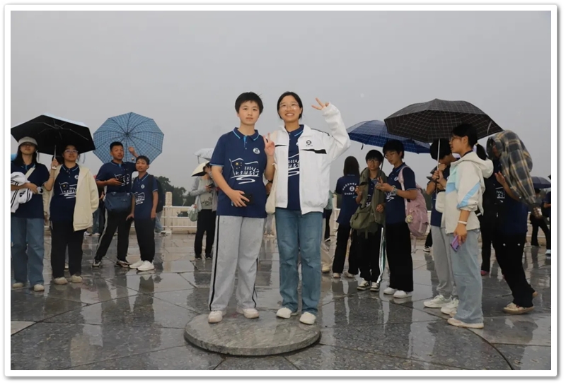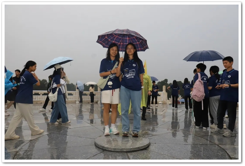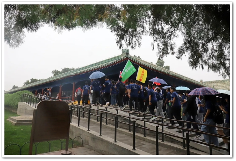 车队抵达天坛公园,晴朗的天空忽降小雨,淅淅沥沥的雨点歇上片刻又降上一阵,且渐渐增多增大。同学们依然兴致盎然,丝毫不受雨势影响。