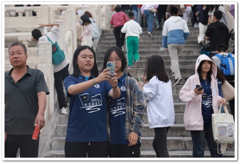 占地面积270万平方米的天坛公园里,严谨的建筑布局、奇特的建筑构造和瑰丽的建筑装饰,无一不令同学们叹为观止、流连忘返。