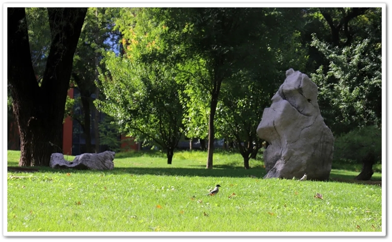 清华园内,旧土木馆、旧水利馆、清华学堂、同方部、新水利馆、大礼堂、科学馆、教室楼环绕四周,广袤平坦的绿茵广场及闻名遐迩的日晷端居其中。