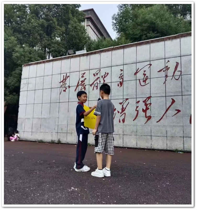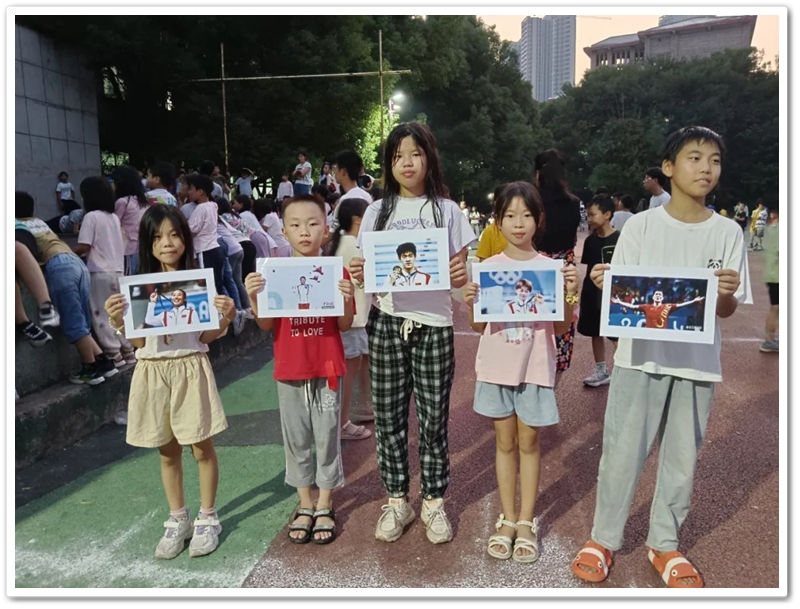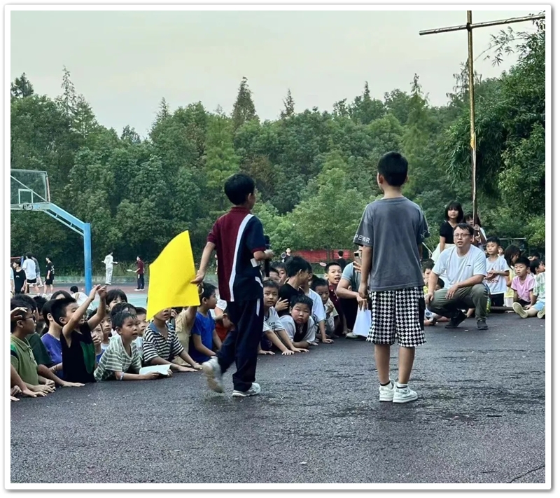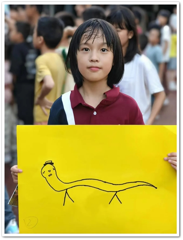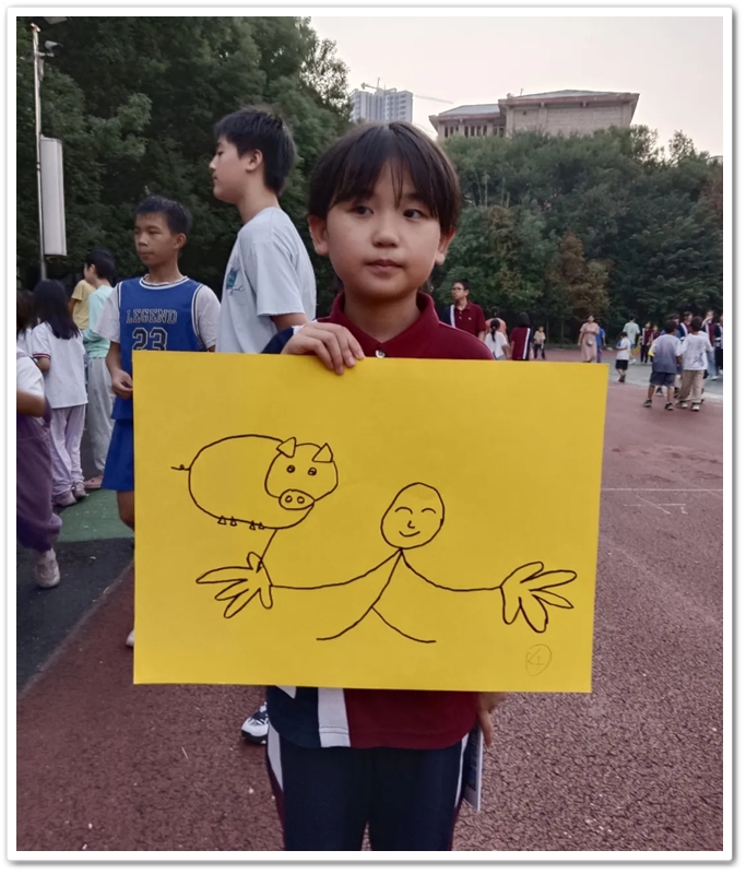 紧接着第三个,第四个……“杯弓蛇影、掌上明珠、颠三倒四、画饼充饥、车水马龙、杯水车薪……”这些“我画你猜”的成语游戏,魔法般将孩子们带入了一个充满想象与创意的世界。台上孩子们用画笔将文字用图片表达出来,台下同学的机智猜测,他们每一次挥笔都是对心灵的描绘,每一次猜测都是智慧的火花碰撞。通过游戏让同学们学会了如何沟通和协作,如何在竞争中寻求共赢,他们的笑声、掌声和欢呼声汇成了一曲生动的交响乐。在同学们欢快的气氛中进入第二环节我运动我快乐。