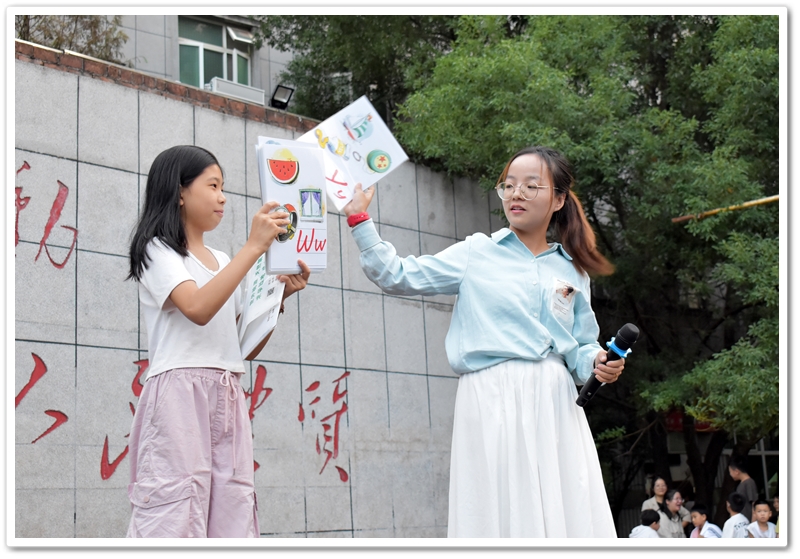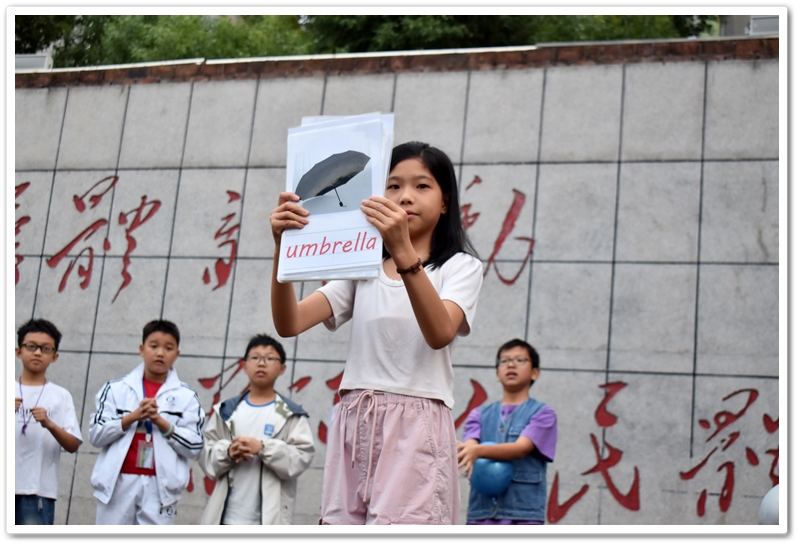 接下来的英语游戏“你做我说”更是将现场的气氛推向了高潮。孩子们分组竞技,用肢体语言传递英语单词,这不仅是对他们团队协作能力的考验,更是英语表达能力的展示。游戏中欢声笑语不断,掌声如潮,孩子们的机智与活泼表露无遗。
