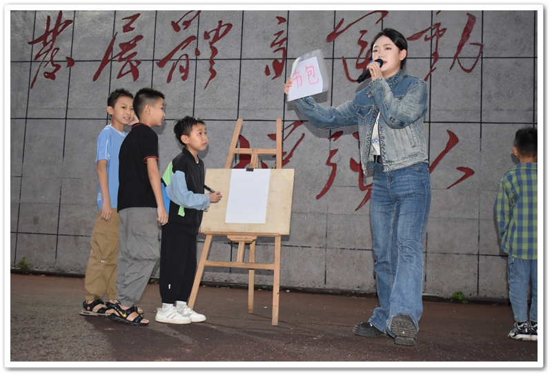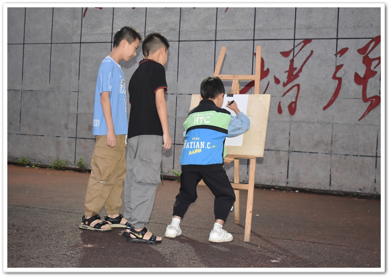 随后的“画画传递”环节进一步激发了学生们的创意与想象。在限定的时间里,他们需以画笔描绘出一个抽中的事物,俩个同学每人画一笔,另一同学猜事物。这一过程既锻炼了孩子们的绘画技巧,也培养了他们的沟通能力和团队精神。