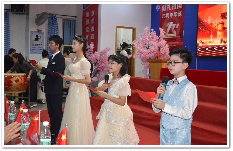 当五十六个民族用心点燃起五十六支希望的蜡烛,让我们千言万语汇成一句话:爱我中华。四年级422班带来了合唱《爱我中华》,他们用欢快的歌声、激昂的朗诵、可爱的的舞姿,颂出了中华民族一家亲,表达了对祖国的热爱。