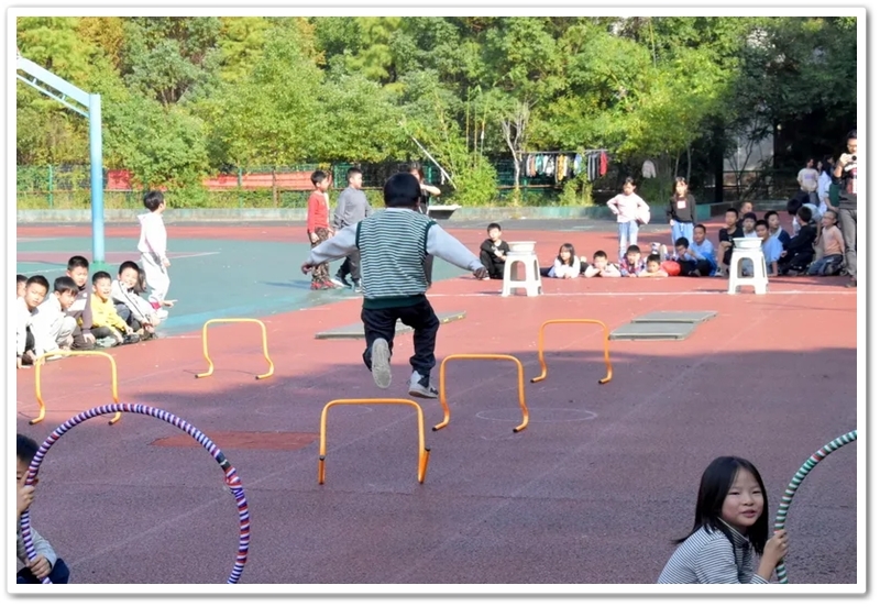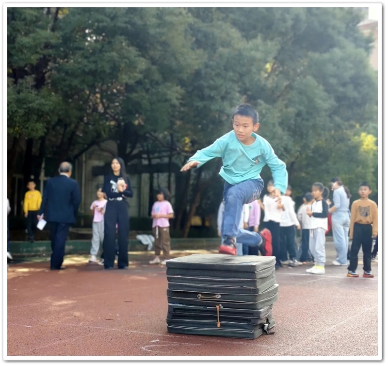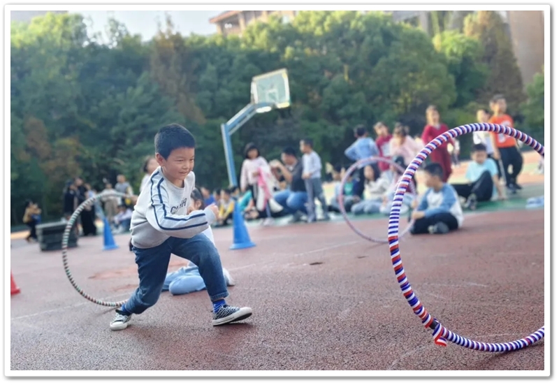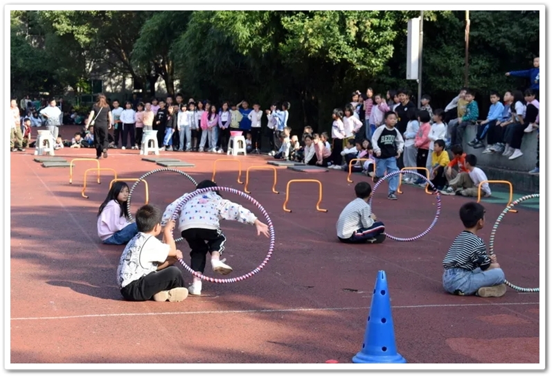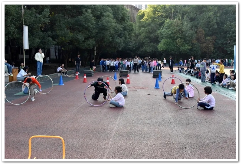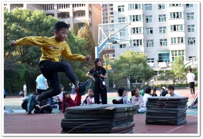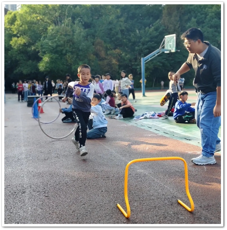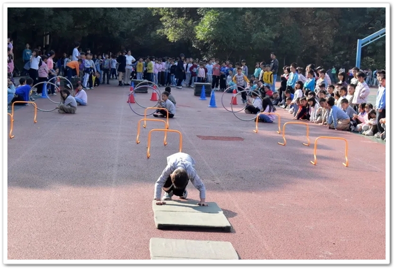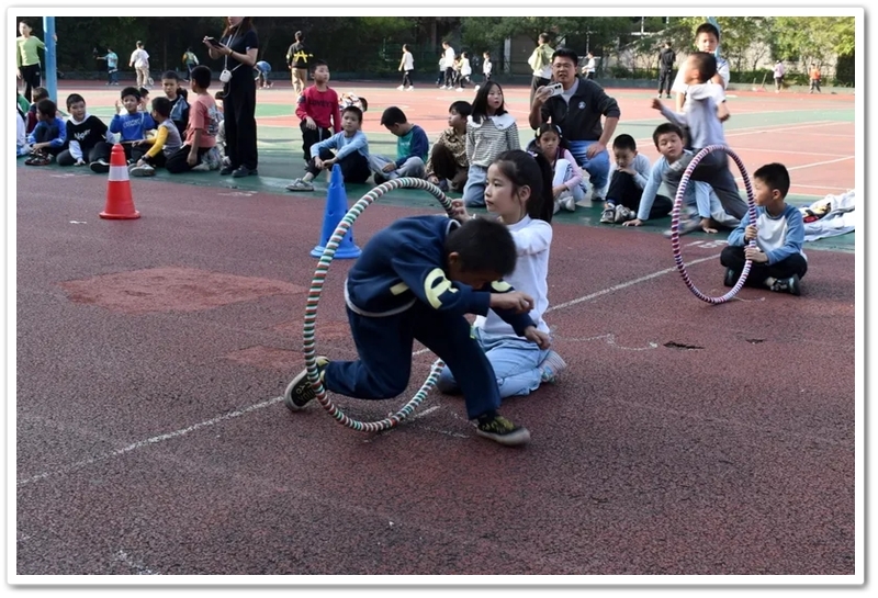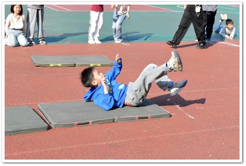 在钻呼啦圈的游戏中,孩子们笑声连连,有的同学因为卡住了,立刻引来旁边伙伴的鼓励与支持,场面温馨而又热闹。而在翻跟头的环节,勇敢的孩子们一个接一个地挑战自己,飞速翻转,尽管摔倒了,他们也毫不气馁,爬起来继续挑战下个环节,眼中闪烁着坚定的光芒。