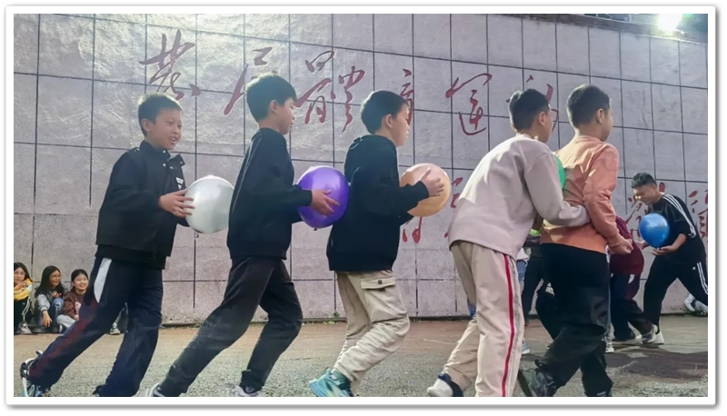 开场舞结束,接下来是趣味游戏——《竞速火车头》的环节。游戏主持人阳秋衡老师亲切地跟同学们打招呼,向同学们讲解游戏规则:由两组同学在起点站队,每队5名同学自由组队,哨声响起,两组的第一位同学同时起跑到终点处拿到气球返回到队友身边,跟第二位同学一起夹着气球继续起跑取气球。以此类推,直到5名同学排成一条长龙,以最先到达终点的队伍为胜。用手去拿气球则为犯规。游戏一开始,大家状况频出,欢乐不断。有的队伍默契十足,迈着稳健的步伐,小心翼翼夹着气球往终点走;有的队伍临时组队,气球总是夹不住,调皮地满场跑,引得台下观众笑声连连。