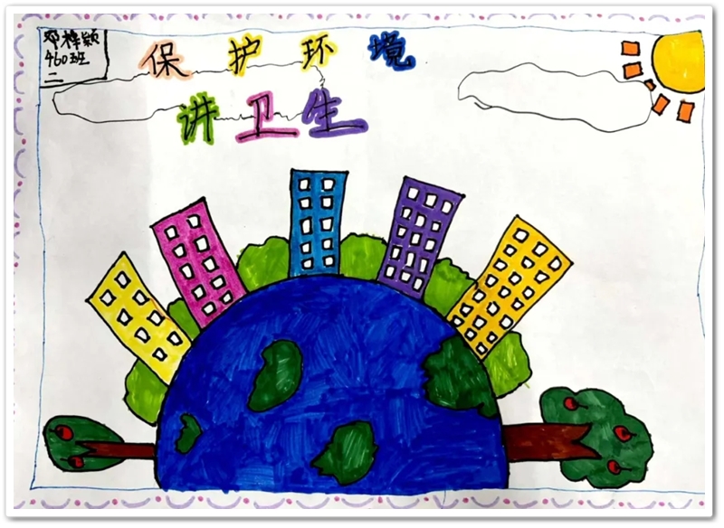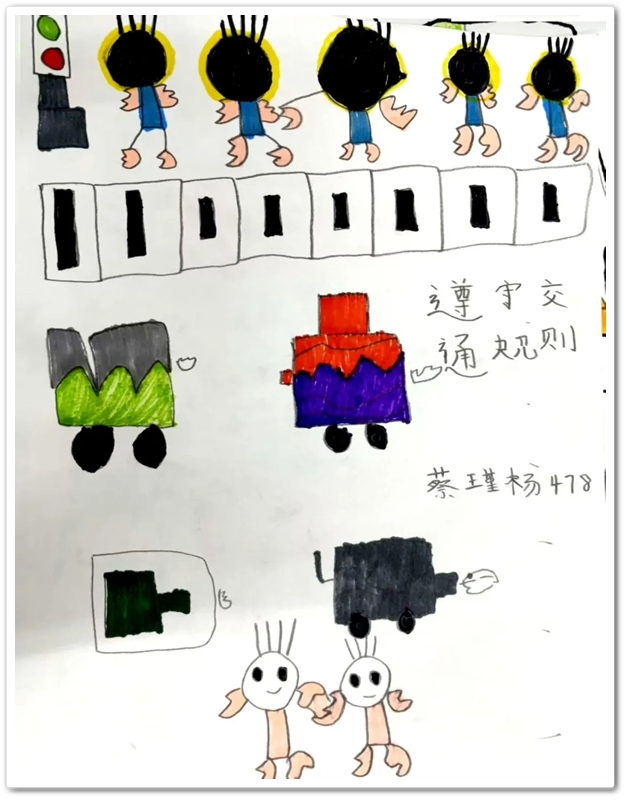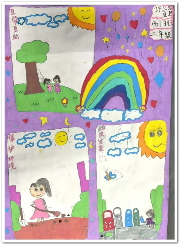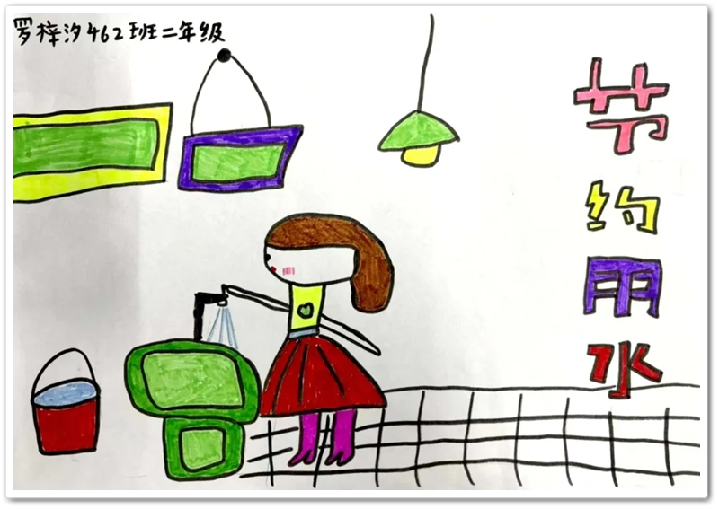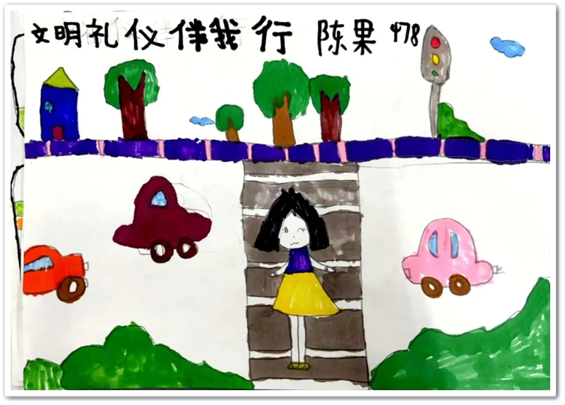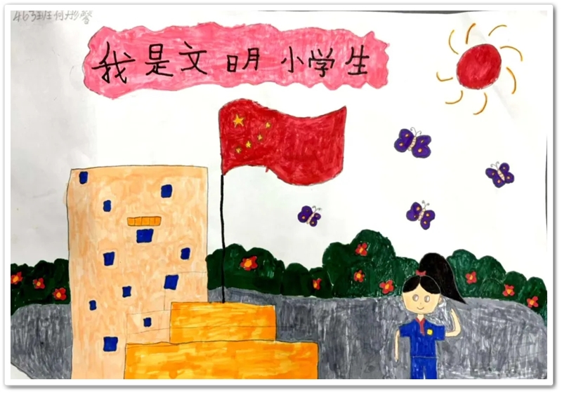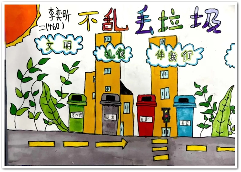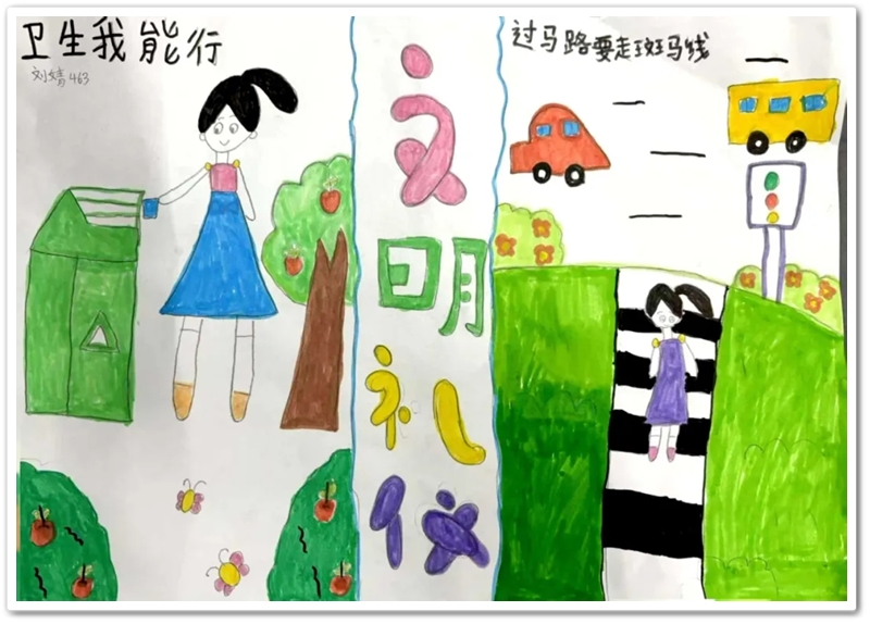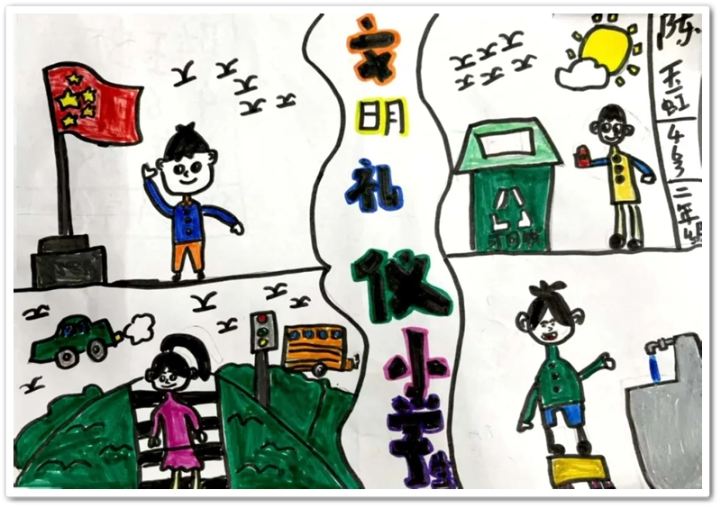 一、二年级主题画的绘制中更是精彩纷呈。孩子们用稚嫩的笔触描绘出他们眼中的文明礼仪世界,热爱祖国、不乱扔垃圾、请节约用水......,画面里充满了文明的身影,小小的细节体现出大大的文明素养。
