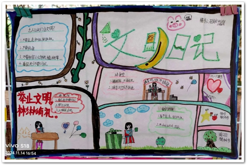 三、四年级手抄报的制作也毫不逊色。同学们精心设计板块,内容丰富多样。从课堂礼仪到就餐礼仪、从文明就寝到文明用语,无不涵盖。手抄报上的字迹工整,绘画精致,每一处都彰显着孩子们对文明礼仪的深入思考。