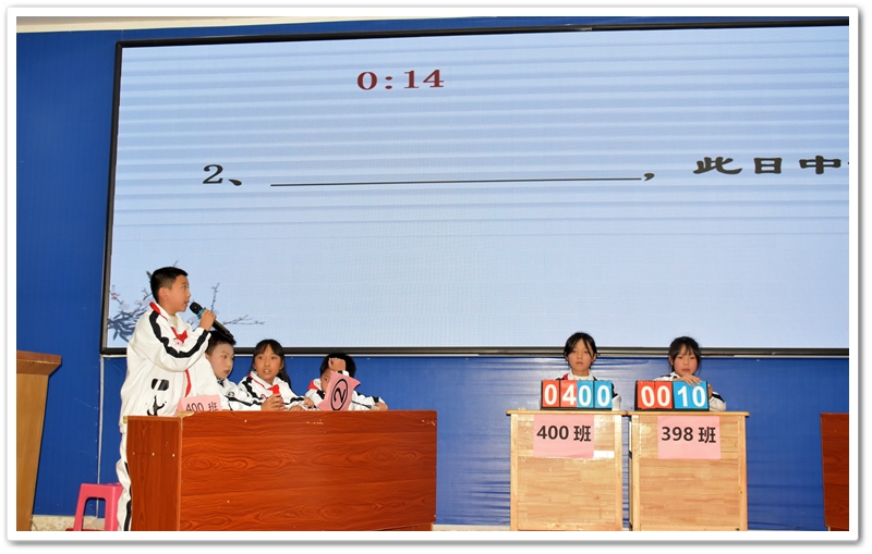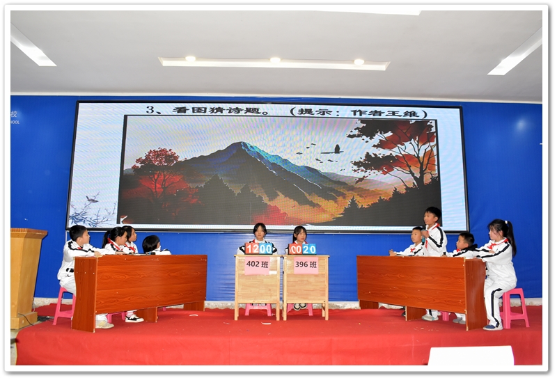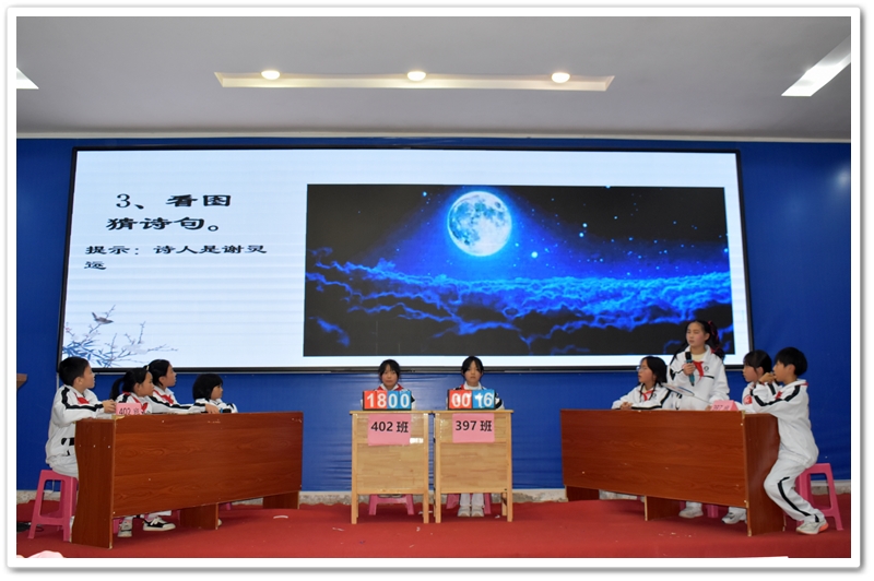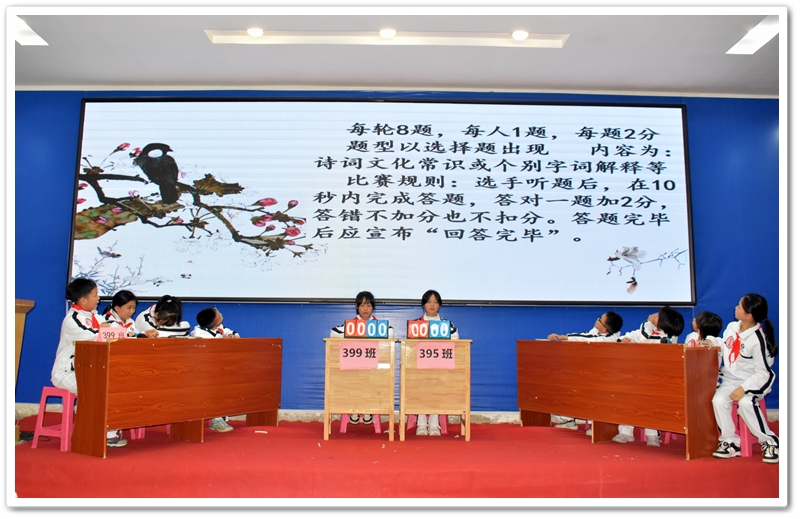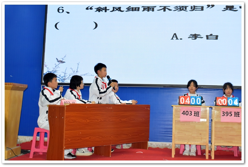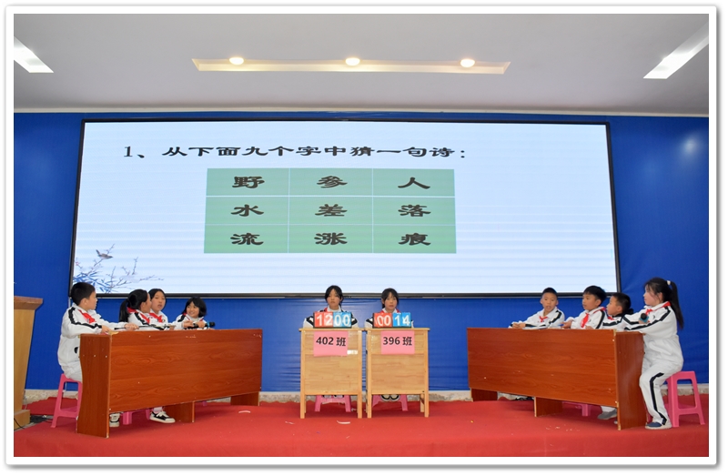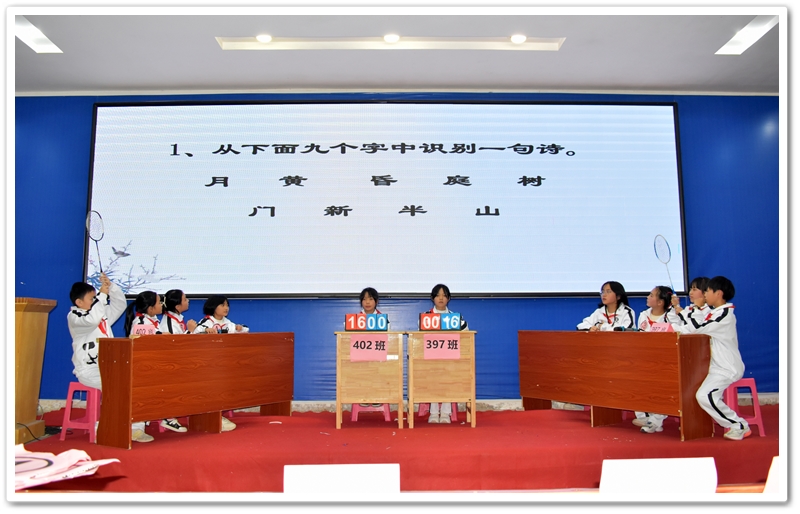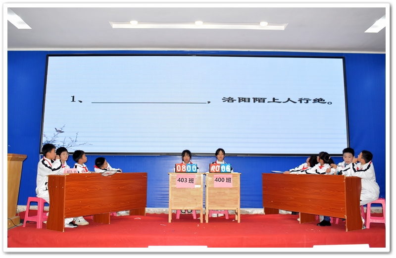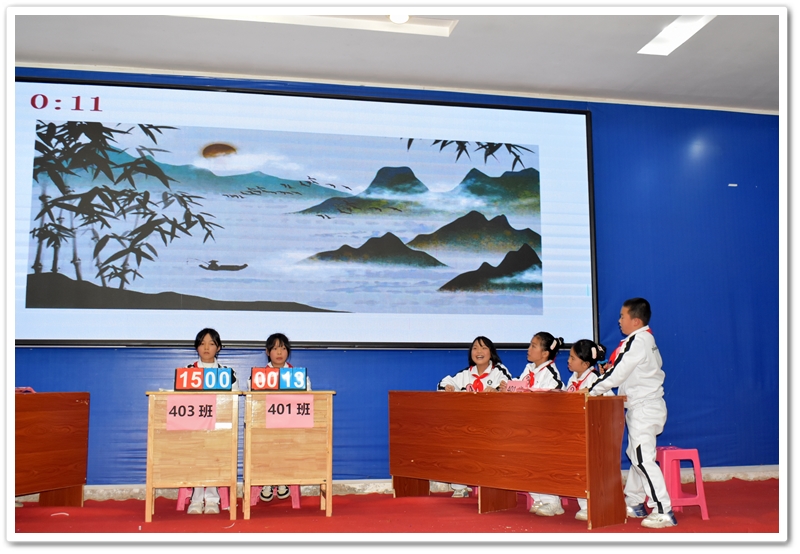 11月21日夜晚,报告厅内华灯初上,人头攒动,诗词大赛在此盛大启幕。赛事分为四轮,涵盖必答题、对对碰、猜猜猜及翻译题,每一环节都高潮迭起,令人屏息。各班精选的四位选手,代表班级出征,他们神采奕奕,意气风发,尽显五年级学子之英姿。