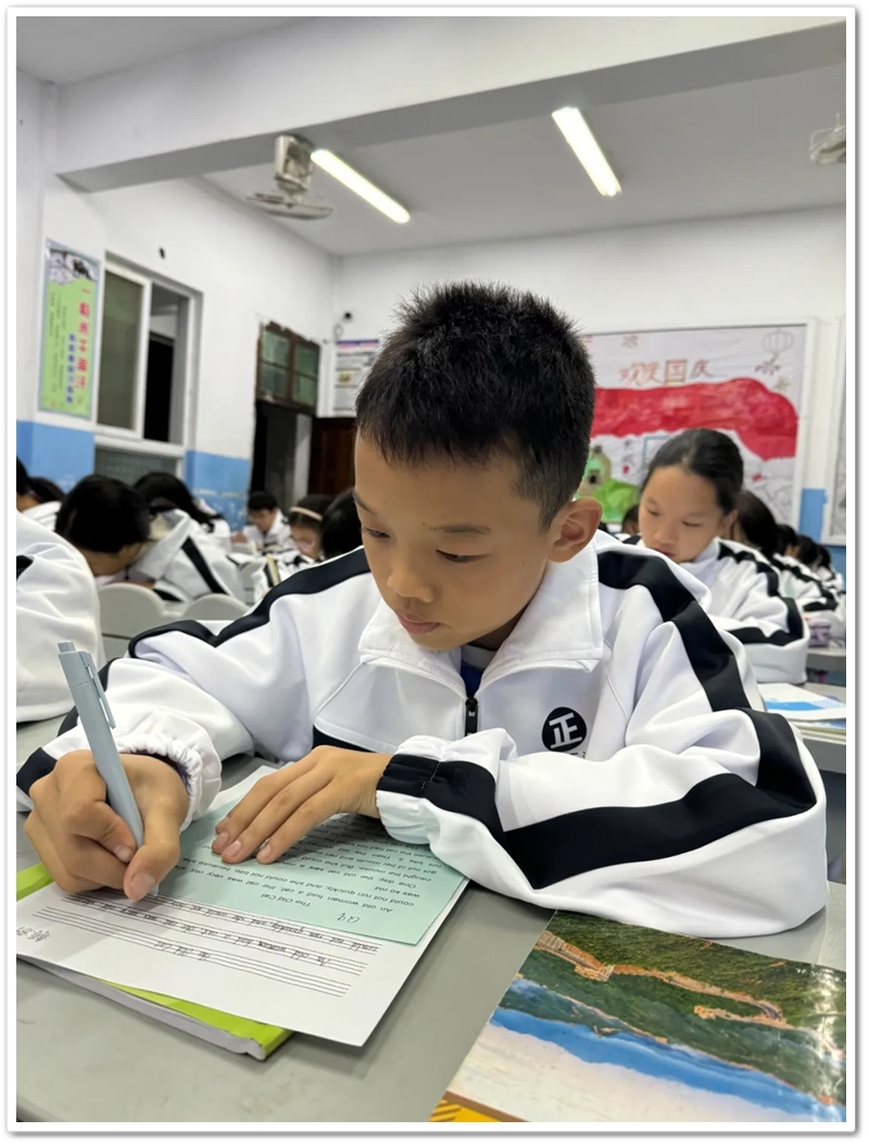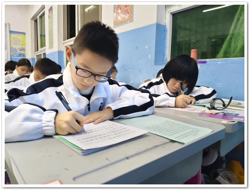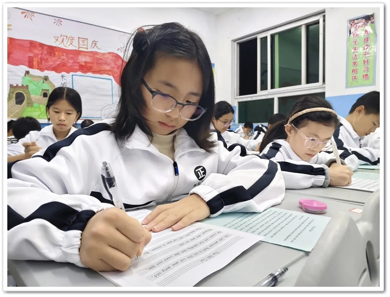 比赛开始了。同学们或紧张、或兴奋、或期待地拿起手中的笔,开始书写。逐渐地,同学们进入忘我的最佳状态,专注、全神贯注地挥洒笔墨。瞧,一笔一划,心神气定;着眼笔尖,心系一处。很快,一篇篇优美俊秀的作品跃然纸上。有的字迹清晰、笔画流畅;有的美观大气,给人一种赏心悦目之感;有的带有节奏感,犹如置身水墨画中。所有这些,无不展示出孩子们扎实的书写功底和积极的学习态度。