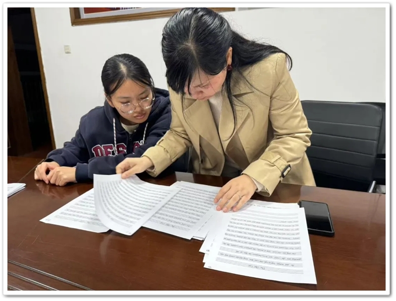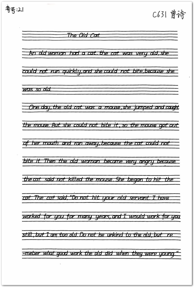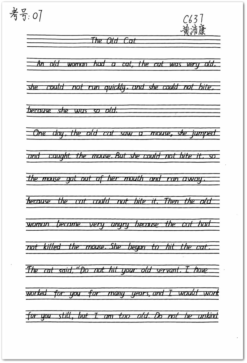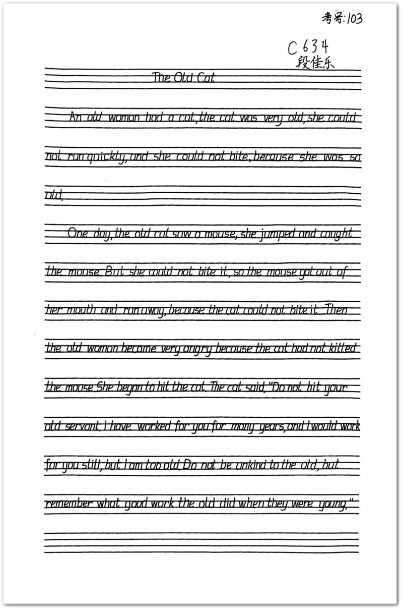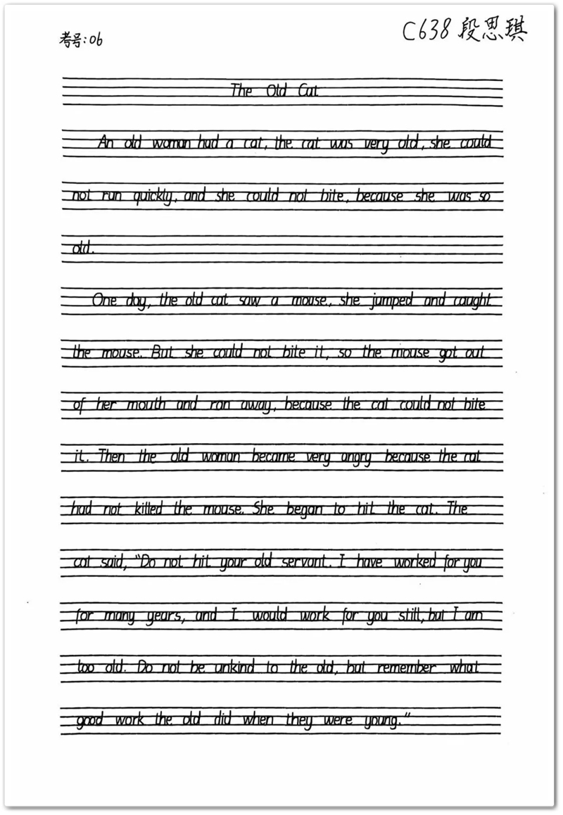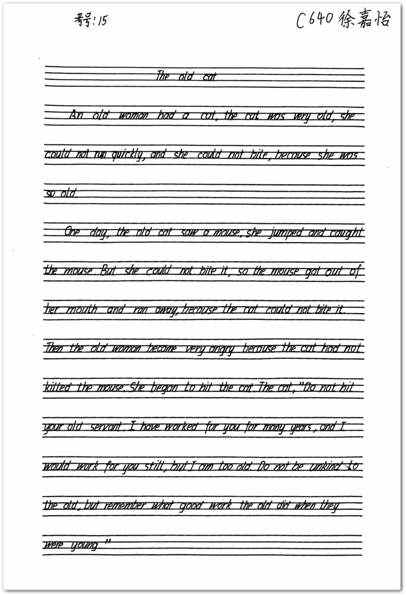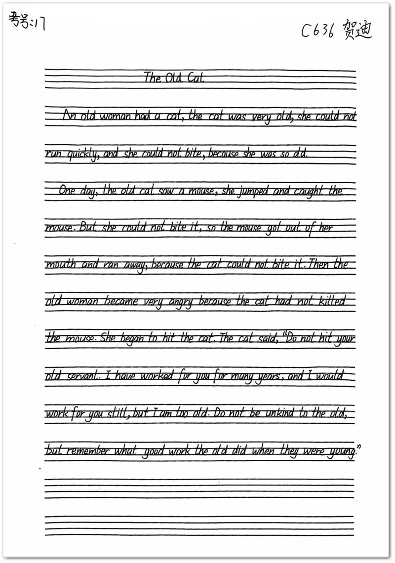 接着,准初一年级备课组长贺月娥对大家的作品做点评,“英语书写出来的,不仅仅是一个个单词符号,更是英语学习者的门面,体现了一个人的精神风貌。本次竞赛,大家展现出来的作品,无论是国标体、还是衡水体,都犹如一幅幅漂亮的绘画,让我们的英文不再单调,而是充满生机和活力。字随终生,不可不练,一手好字,受益终生。愿同学们紧我手中的笔,认真写好每一个字母。写出自己的未来,写出自己的精彩人生!”