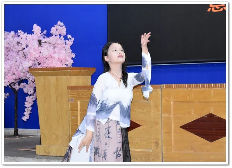 十号选手来自准高一年级377班刘雨歌同学,作品《如愿》,你是遥遥的路,你是明月清风,而我将爱你所爱的人间,愿你所愿的笑脸……一句句歌词,阐述了先辈们的拼搏,为我们后生换回了太平盛世,此致敬礼!