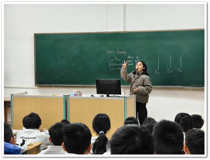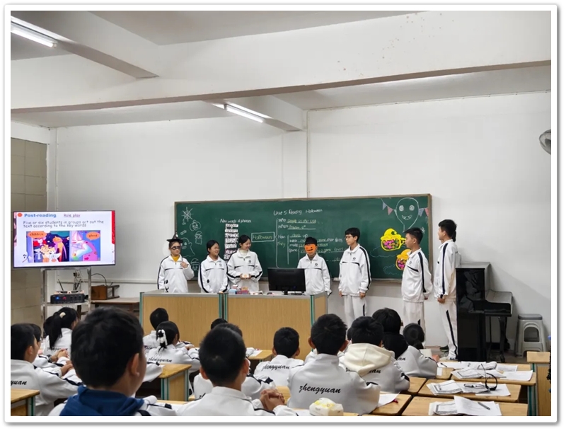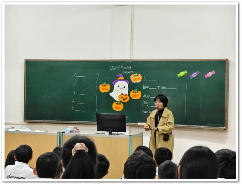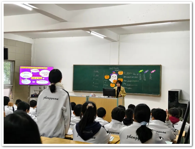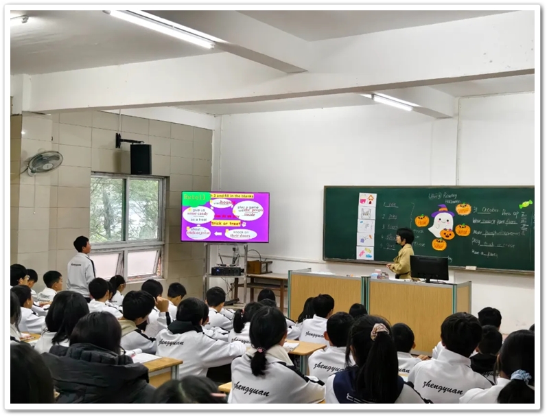 游戏中巩固新单词、分角色扮演"trick or treat",体会万圣节的乐趣、"festival"单词的特殊构成法,展示庆祝节日的意义,同学们在Miss Zhou这些趣味横生的教学方式引领下尽情享受节日的盛宴。