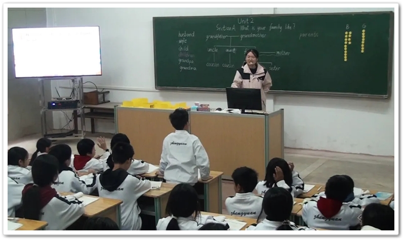 龙成慧老师入职还不到半年。但她的全英文教学,以及清晰流畅的口语已让她的课堂充满了浓浓的英语氛围。Miss Long先播放了一段“小猪佩奇”介绍自己家人的视频,以此巧妙地引出“Family members”这一主题。接着,Miss Long巧妙地运用自己真实的家人照片作为教学媒介,引入新单词并介绍家庭成员之间的关系。这种方式不仅极大地吸引了学生们的注意力,还帮助学生更好地理解了实际生活中的家庭构成。然后,通过一首富有韵律的chant,进一步加深了学生对家庭成员单词及其相互关系的记忆与理解。操练时,学生扮演家庭角色,自编对话进行练习,这一环节不仅让学生将所学知识付诸实践,还提升了他们的口语表达能力。最后,通过《Love is sweet》歌曲,引导学生深入思考如何向家人表达爱意,完美地实现了情感教学。