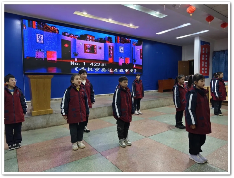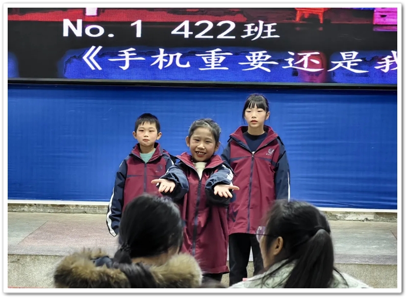 第一个节目是422班同学带来的情景剧《手机重要还是我重要》。在这个快节奏的数字时代,手机已经成为我们生活中不可或缺的一部分,但它是否真的比我们的亲情和陪伴更重要呢?这个情景剧中,孩子们通过生动的表演,告诉我们:他们希望爸爸妈妈能多陪陪他们,放下手机,好好聊聊天,说说话。其实,孩子们要的并不多,他们只是希望能在父母的陪伴下快乐成长。在观看孩子们的精彩表演的同时,我们也反思一下:在我们的生活中,手机和亲情之间,哪个更重要呢?