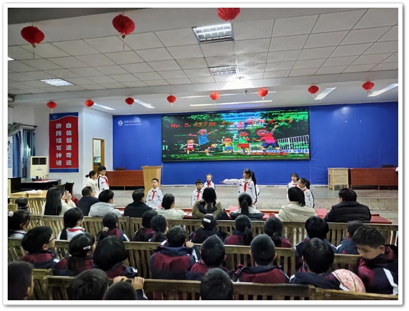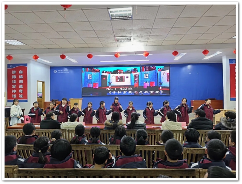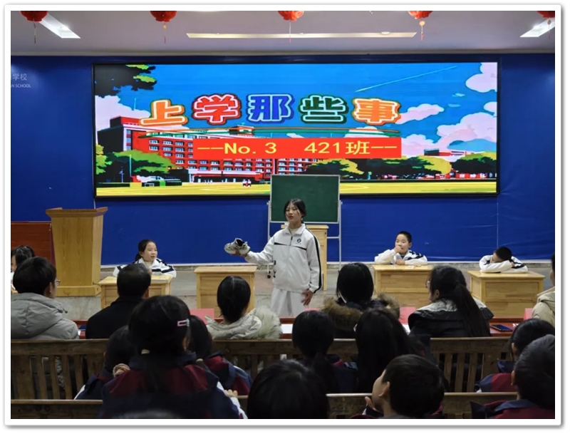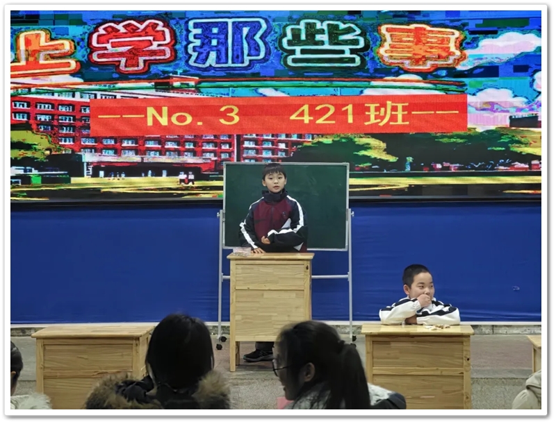 我们的校园生活如诗般美好,五彩的童年在这里绽放,知识的乳液在这里流淌;我们的校园生活像画般美丽,无限的活力在这里张扬,处处充满了色彩与希望。421班《上学那些事儿》讲述了师生之间发生的事——老师想参评优秀班集体,但由于一系列原因,评优资格被取消后,学生们决定在下学期争取获得优秀班集体。台上同学们投入的表演,让台下同学情不自禁地发出一阵阵惊叹!