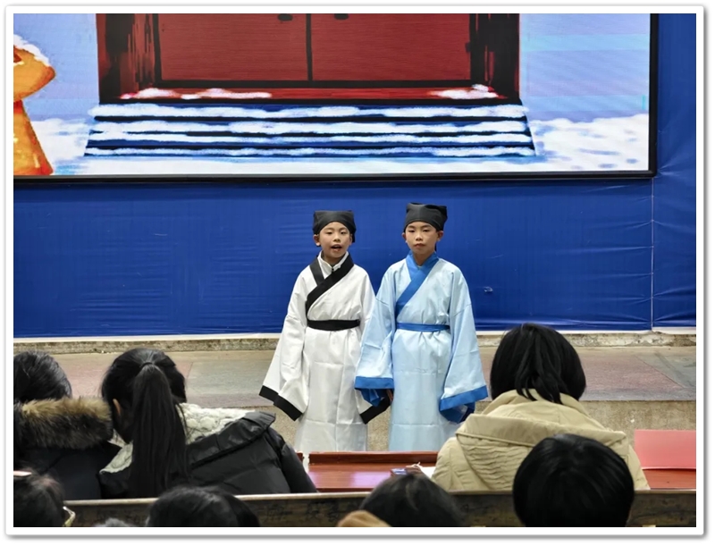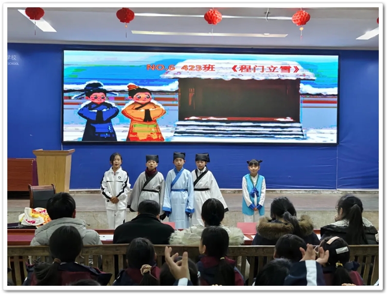 三尺讲台,三寸舌,三寸笔,三千桃李;十年树木,十载风,十载雨,十万栋梁。《程门立雪》这个故事讲的是杨时与同学游酢在下雪的天气去拜访叫程颐的大学问家,结果程颐在睡觉。他们在雪地里等着程颐醒来,直到积雪下了近一尺深。赞扬那些求学师门,诚心专志,尊师重道的学子。423班同学的表演,让同学们进一步体会到尊师重教这一中华民族的传统美德。