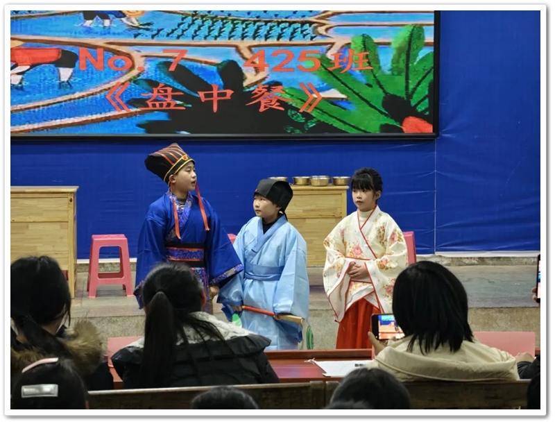 “一粥一饭,当思来处不易;半丝半缕,恒念物力维艰。”425班同学表演的话剧《盘中餐》,让同学们明白作为新时代的小学生,节约粮食仍然是他们应尽的责任;作为祖国的接班人,要有“珍惜粮食,从我做起”的自觉性,传承好中华民族的传统美德,努力在全社会营造“反对铺张浪费,厉行节约粮食”的氛围工作中,扮演好推动者和执行者的角色!美德始于心,节俭践于行。我们相信,孩子们心中这颗珍惜粮食的种子,会伴随着他们的健康成长,生根、发芽、枝繁叶茂!