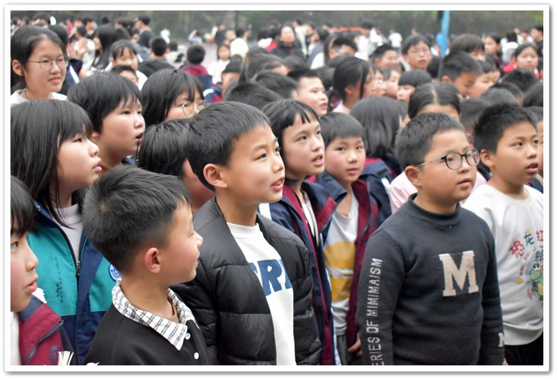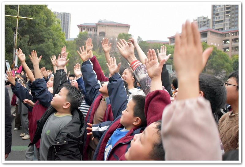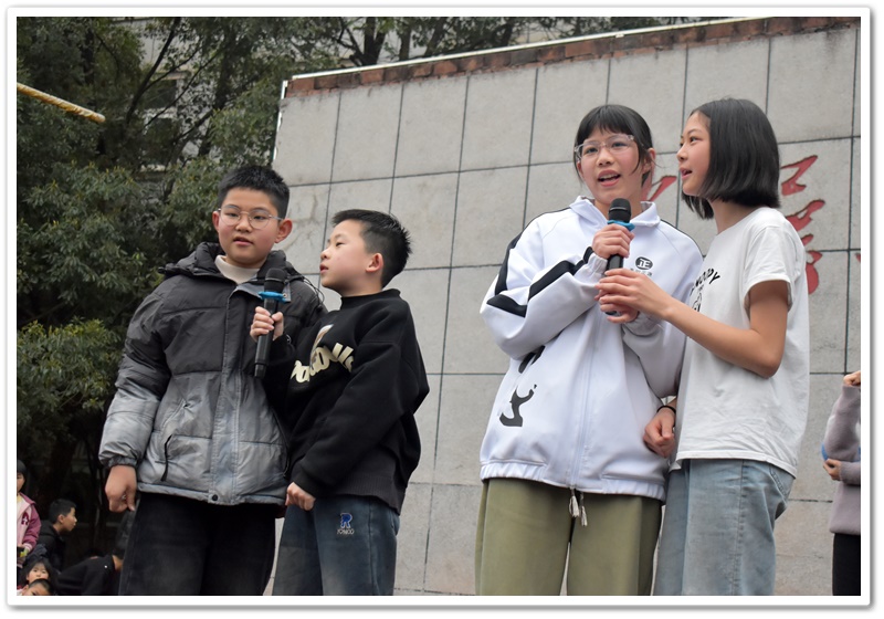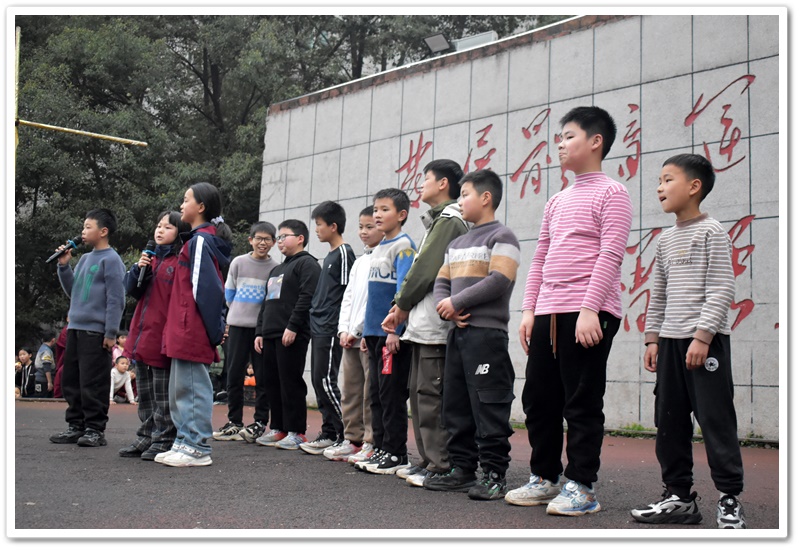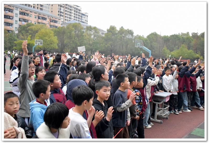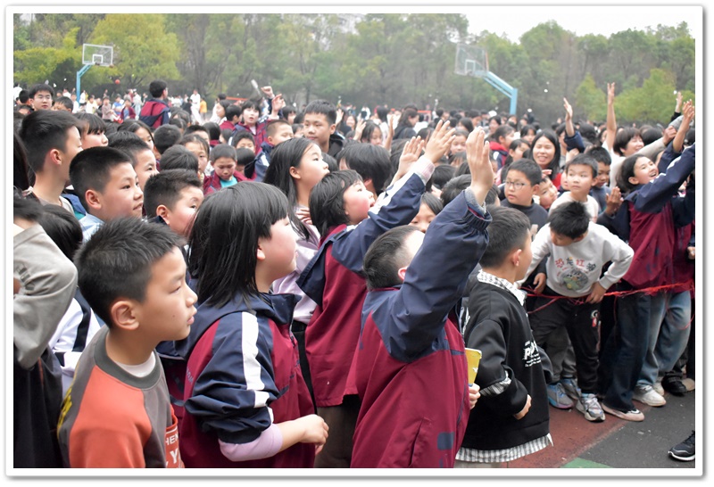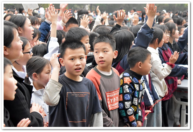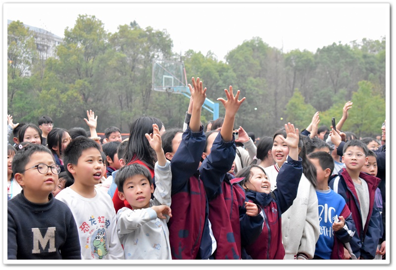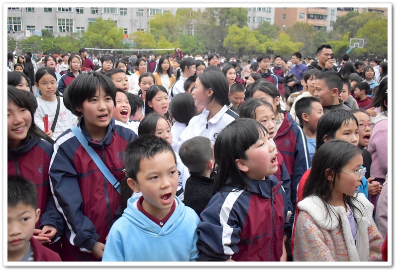 你看,播放音乐时,上台的同学侧耳倾听,现场氛围从先前的轻松激动转变为了静谧紧张。同学们大脑飞速运转,思索着音乐的名字。有的已经有了猜测但依然犹豫不决,只想再听多一点确保答案正确。此时此刻,只有音乐声在空阔的活动场地内肆意闯荡。第一首歌名成功被猜对,同学们的热情更加高涨,在之后的音乐播放中,同学争先恐后地举手抢答,甚至碰到了熟悉的曲子,在播放的30秒内就说出了正确答案。那富有感染力的歌声,时而如潺潺溪流,温柔细腻,诉说着童年的美好与憧憬;时而又似激昂的海浪,澎湃有力,表达着对梦想的执着追求。最后,同学们被婉转的歌声深深吸引,忍不住共同唱起了《童年》这首歌,小手随着音乐节奏轻轻挥舞,现场宛如一片星光闪烁的欢乐海洋!