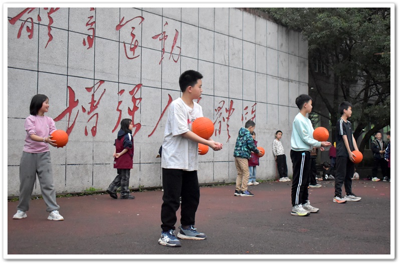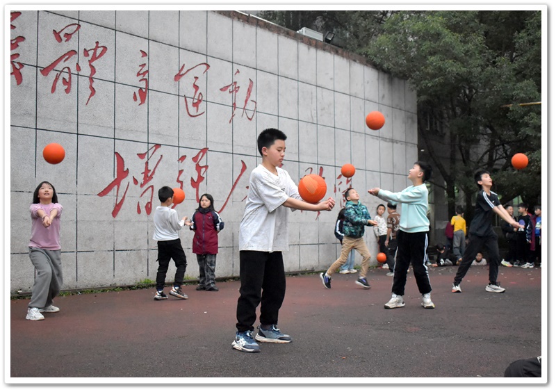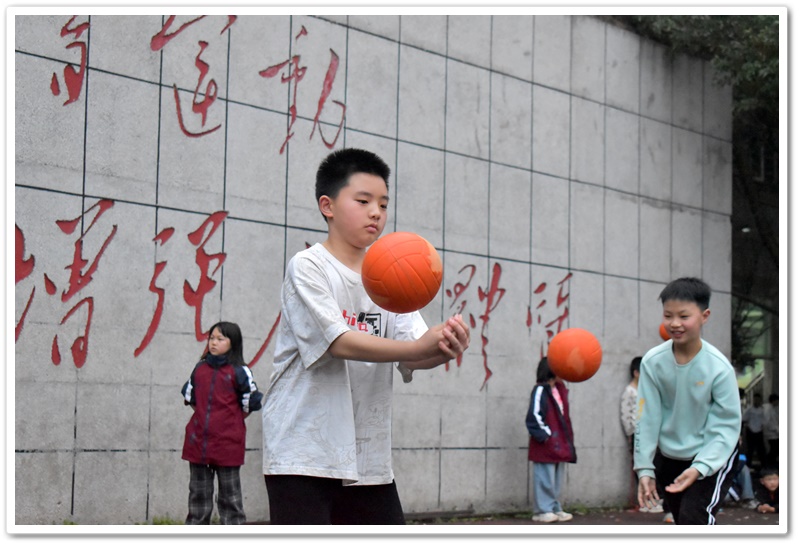 台上参加快乐垫活动的同学手持排球,眼神中闪烁着期待与挑战的兴奋。这些排球不仅是游戏的道具,更是通向欢乐的钥匙。一场趣味与技巧并存的快乐垫大战即将拉开帷幕:同学们站在舞台中央,微微弯腰,双腿分开与肩同宽,眼睛紧紧盯着手中那颗排球,就像一位严阵以待的战士在凝视着自己的武器。随着裁判一声令下,他们开始有节奏地垫球。排球在他们的手臂上轻快地弹起落下,每一次触球都准确无误,发出富有韵律的“砰砰”声,仿佛是他们奏响的独特战歌。这战歌点燃了所有人心中的激情,台上台下的同学都瞬间沸腾起来,欢呼声如潮水般汹涌澎湃。