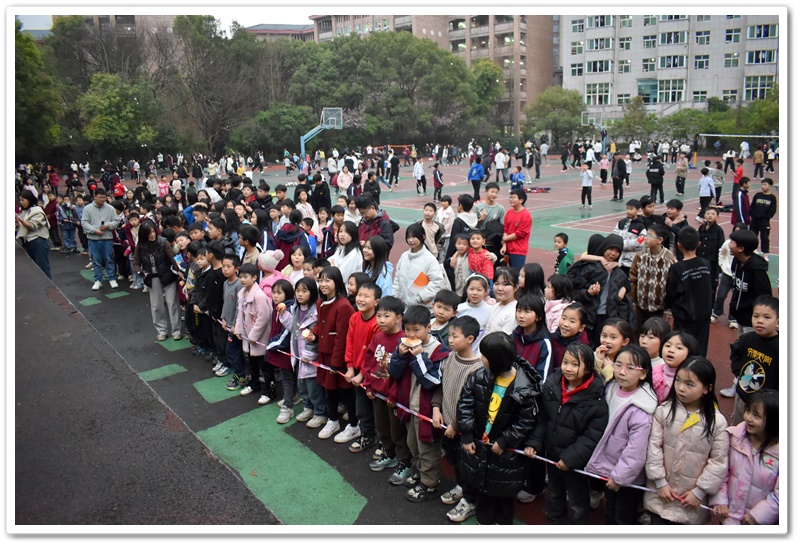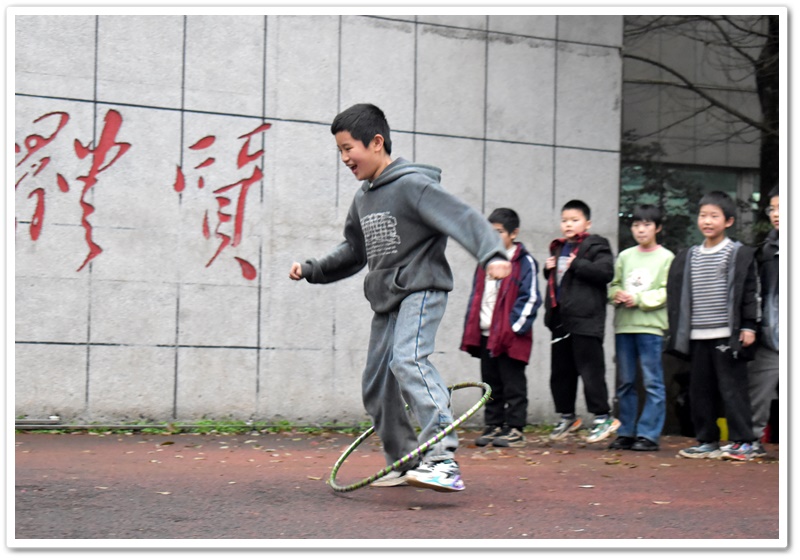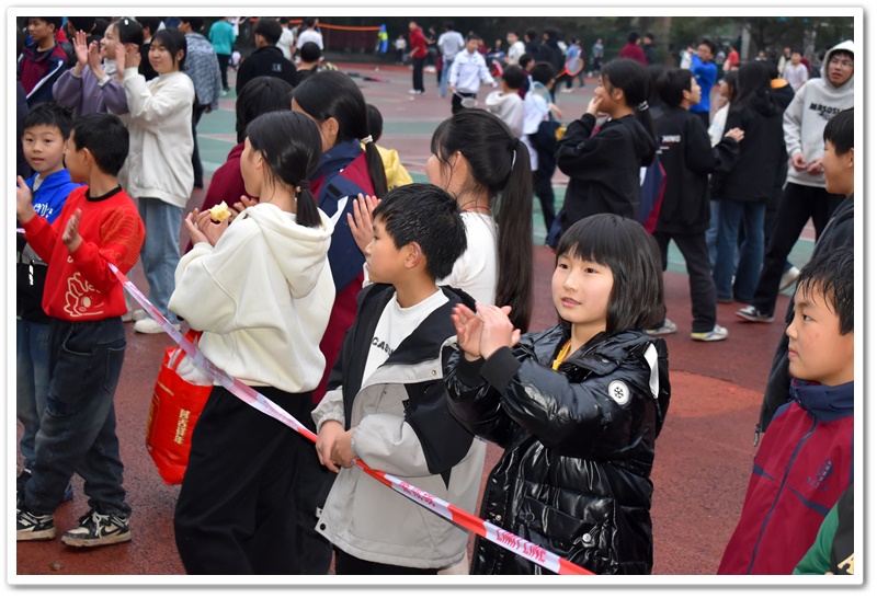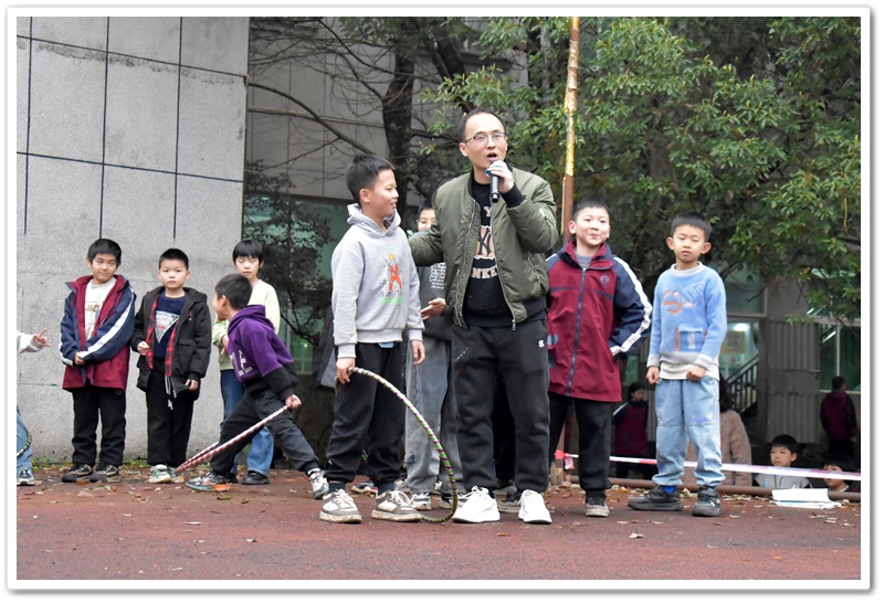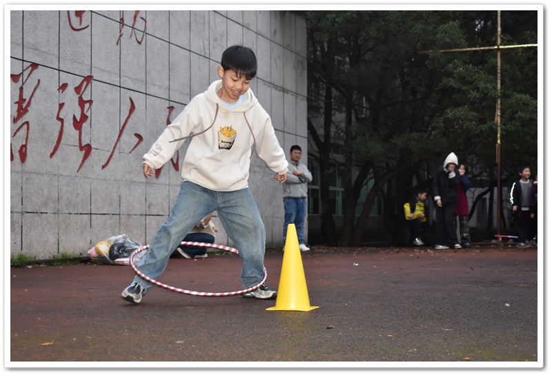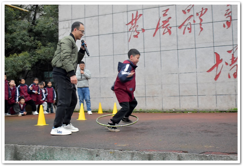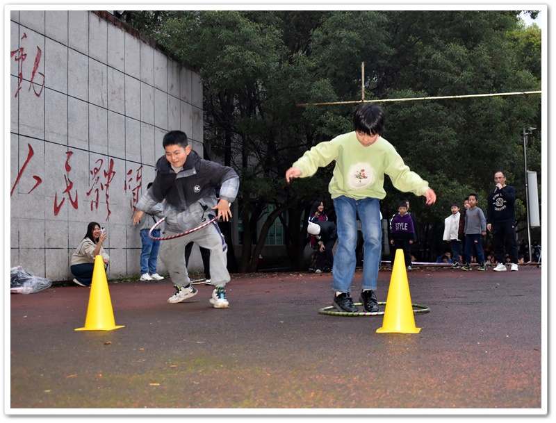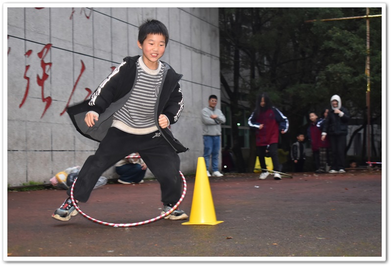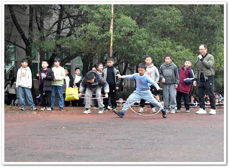 随着主持人谢老师的一声“开始”,比赛拉开序幕。只见同学们手忙脚乱地传递着“风火轮”(呼啦圈),有的同学灵活得像只小猴子,轻松地将“风火轮”(呼啦圈)传递到下一位队友脚中;有的同学则显得有些笨拙,“风火轮”(呼啦圈)半道掉在地上不配合,急得直跺脚。场下的啦啦队也没闲着,他们大声呼喊着,大声为台上的小选手们加油助威。最后一个轮回,谢老师还把我们三年级的四位老师一同邀请上台与同学们比拼,师生同台,玩得不亦乐乎。整个操场充满了欢声笑语,仿佛一片欢乐的海洋。