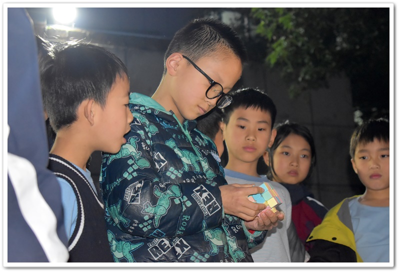 最后登场的是“学生才艺展示”。这是同学们展示自我、放飞梦想的舞台。前两位同学展示了动听的歌声,他们用稚嫩的嗓音唱出了对生活的热爱和对未来的憧憬。第三位同学给大家展示了精彩的魔方表演,魔方在他灵巧的手中快速转动,色彩斑斓的方块发出轻微的“咔嗒”声。他目光专注,手指灵活地翻转、旋转,仿佛在与时间赛跑。周围的同学屏息凝神,目光紧盯着那逐渐恢复整齐的色块。突然,最后一转完成,六面颜色完美统一。周围响起一阵赞叹与掌声,引得台下观众阵阵惊呼。
