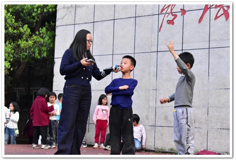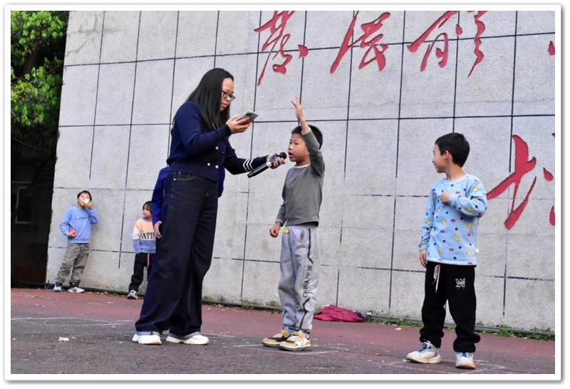 第二个游戏是《我爱记歌词》,由老师播放歌曲,小朋友接龙唱出后面的歌词。台上小朋友自信大方,脑袋随着旋律轻轻晃动,全力调动每一丝记忆,当熟悉的歌词从他口中顺畅唱出,脸上瞬间绽放出自信的光芒。台下的同学也高高举手,身体前倾,满脸期待,被选中后兴奋地接过话筒,大声跟唱,那股子冲劲和投入让现场气氛瞬间高涨。