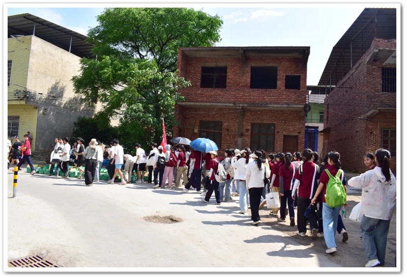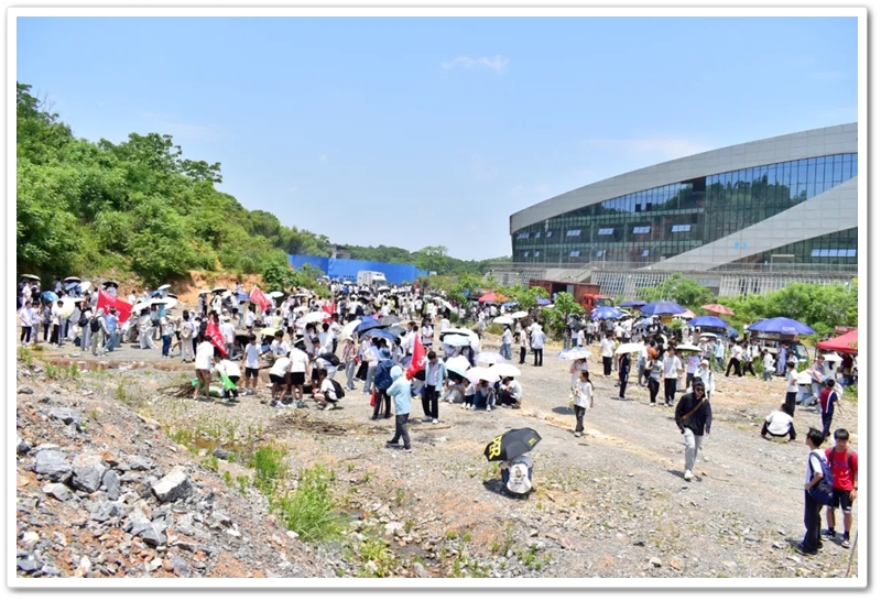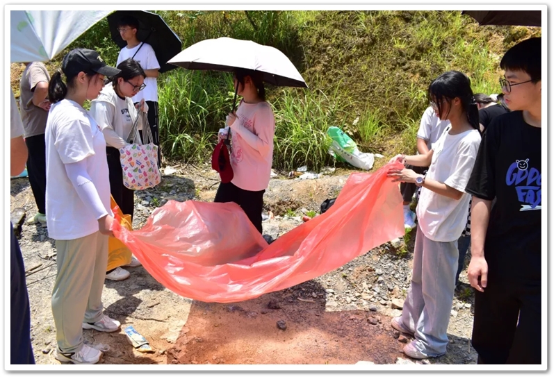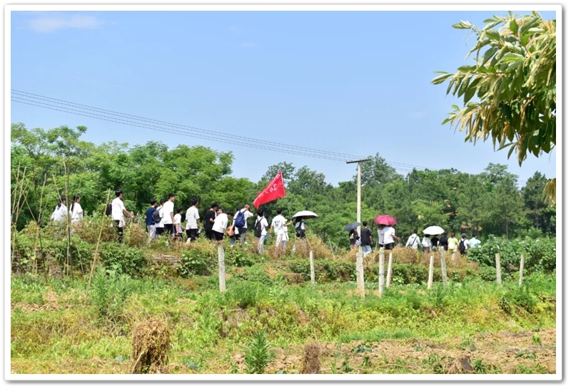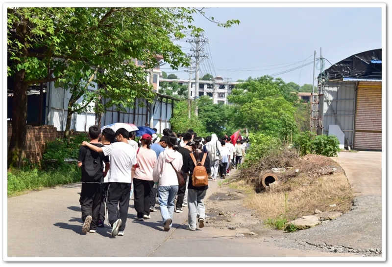 转入南平亭路的乡间小道,真正的考验方才开始。野花芬芳,蝴蝶翩然,草木青葱,空气清新,但泥路上散落的碎石考验着鞋底的抓地力,五月的暖阳逐渐攀上中天。同学们额角沁出细密汗珠,领水处的老师们早已等候多时。补充水分,重整旗鼓,同学们浩浩荡荡地继续前行。